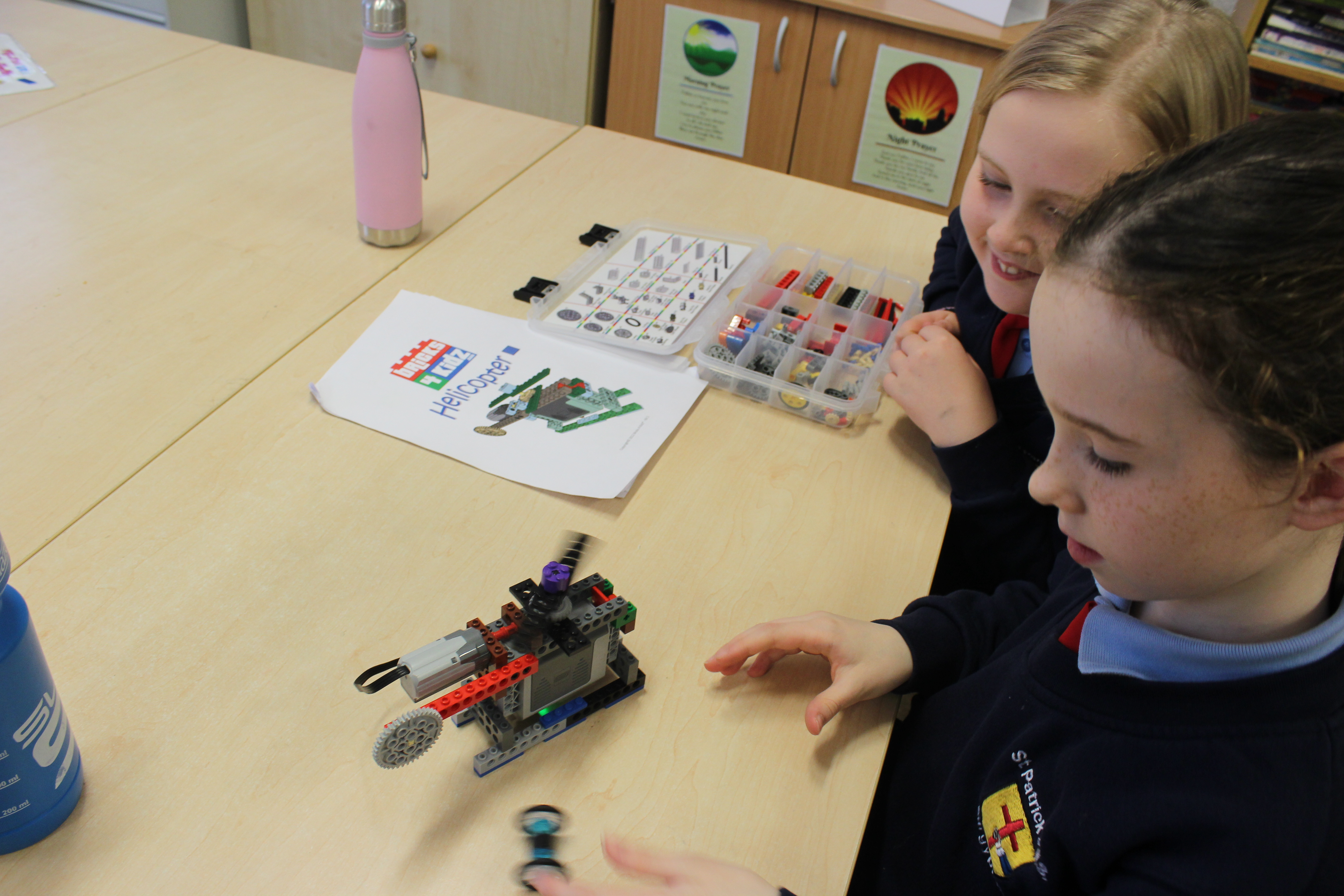 First the two ladies made us watch a video about helicopters. Next they gave us our Lego kits and we started. It took about 21 minutes and whenever it was finished the propellers moved but the helicopter did not fly but it was really fun. Then they said break the helicopter up and put it all in the right places. Finally they said well done for all the great work.