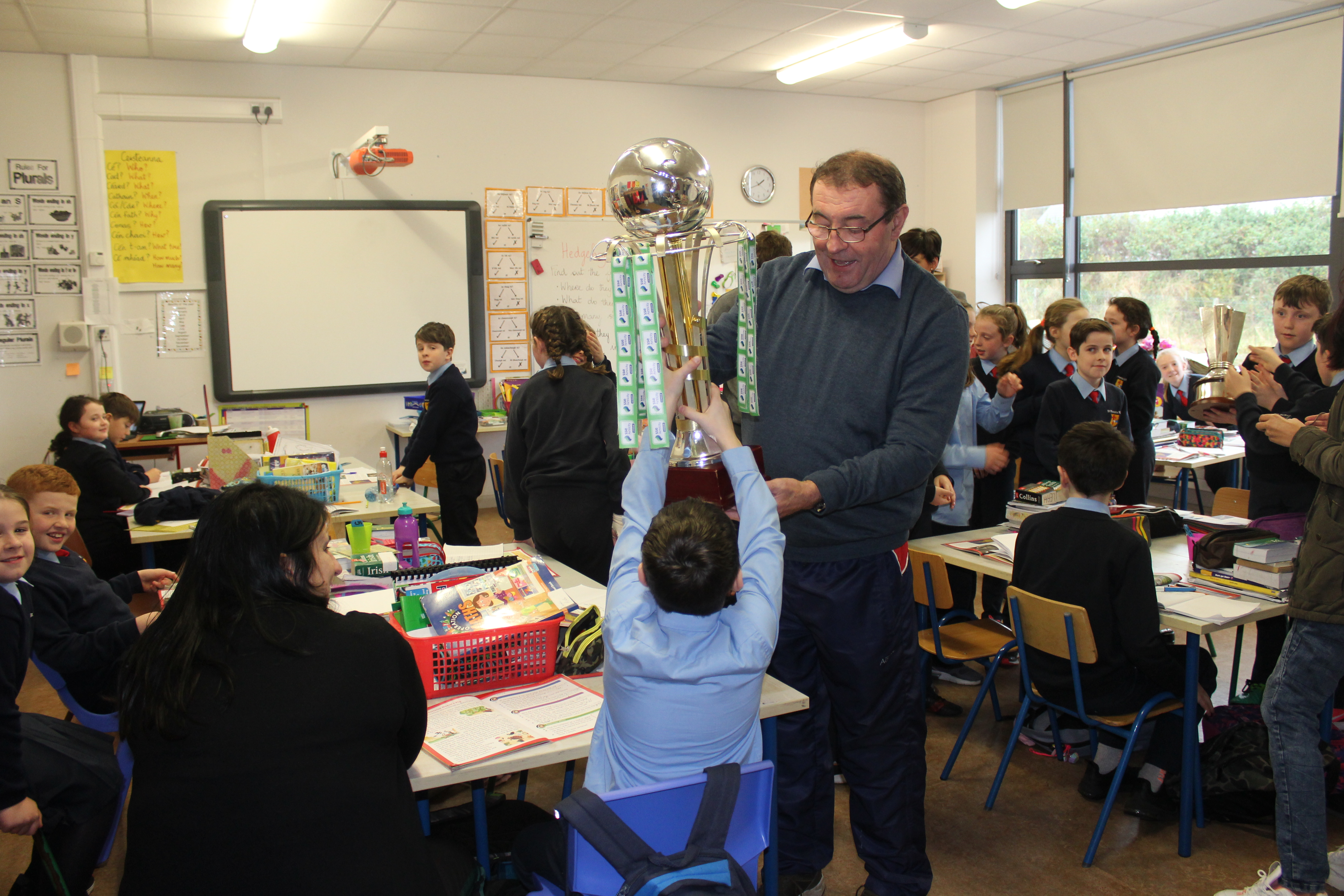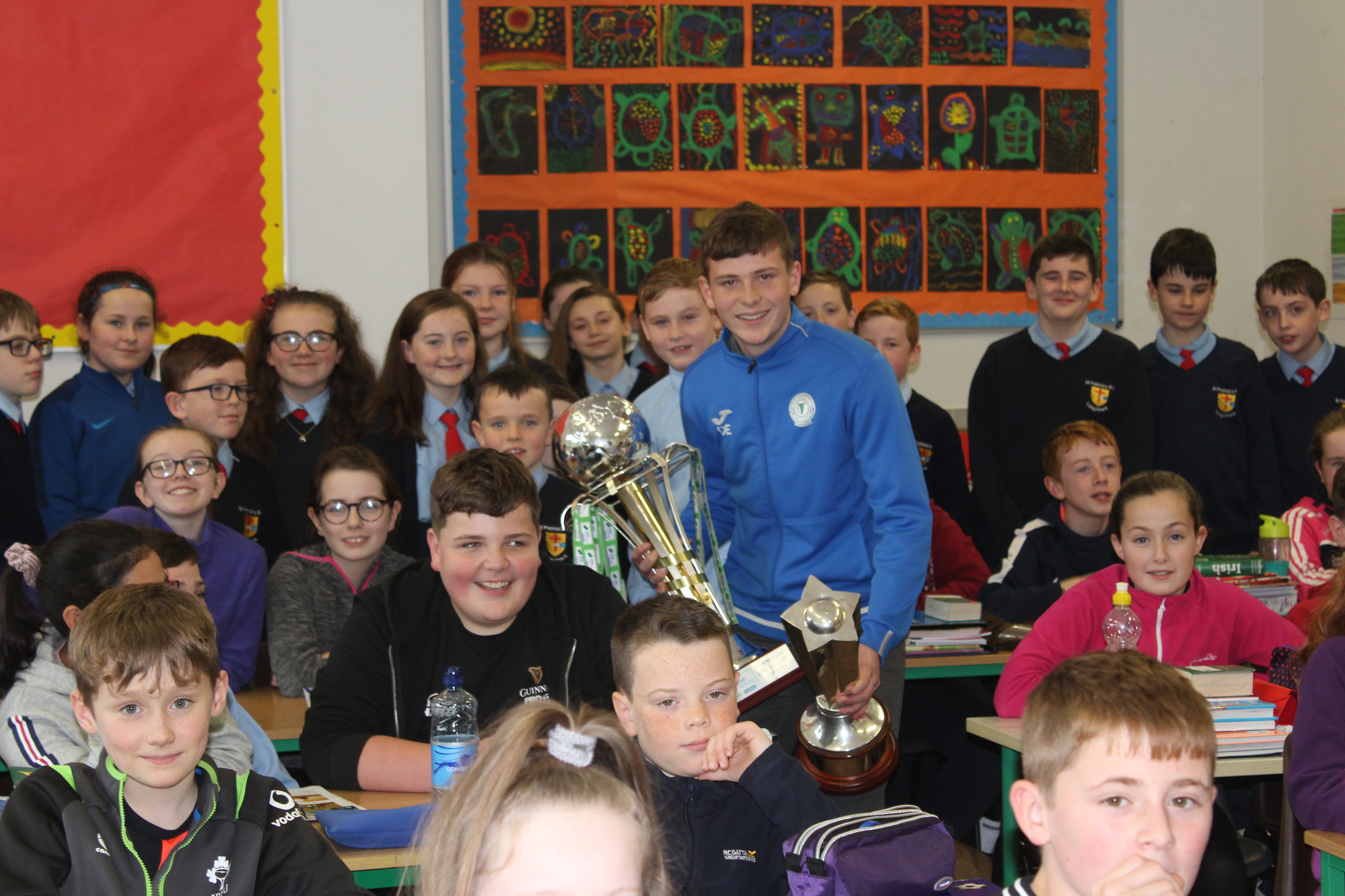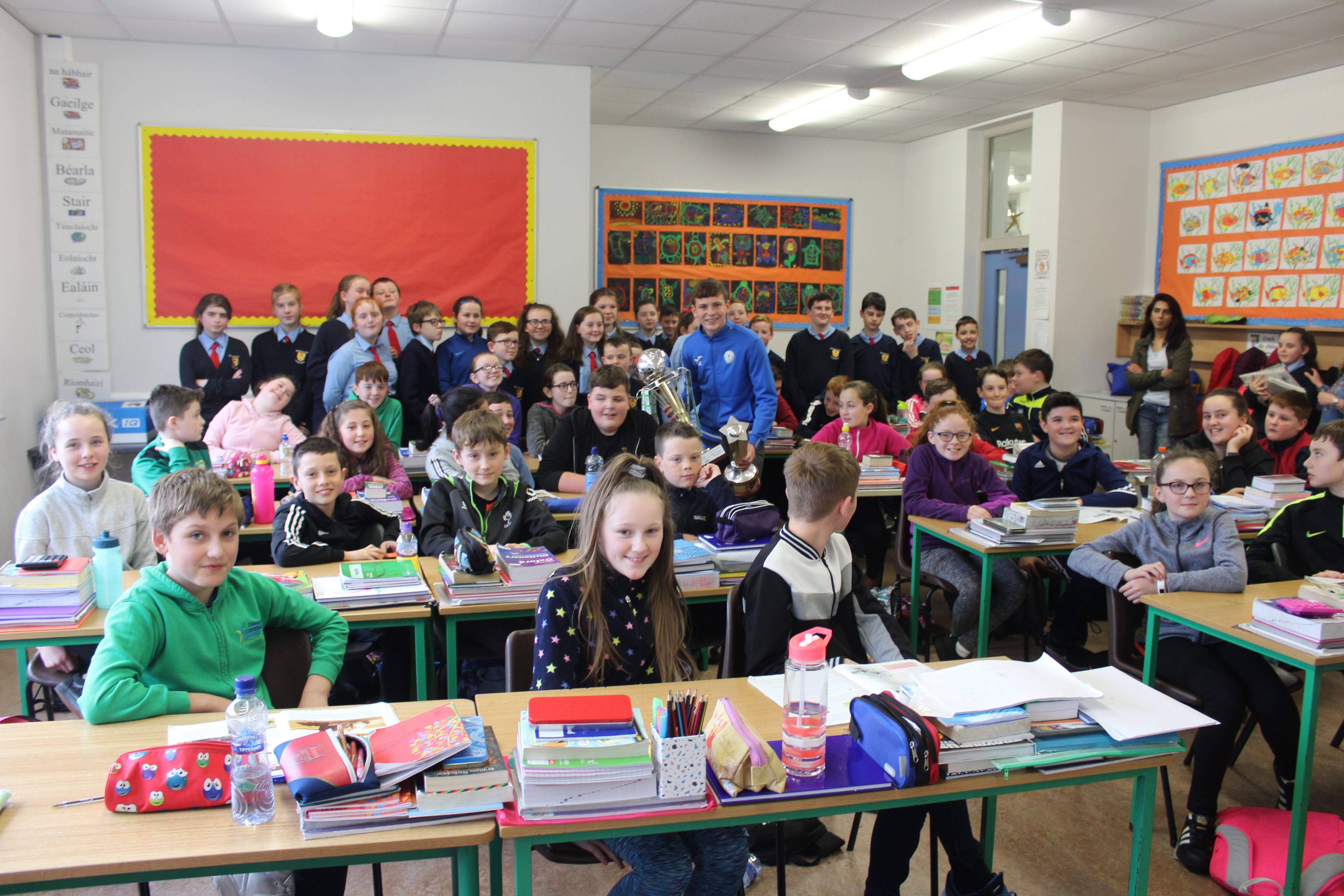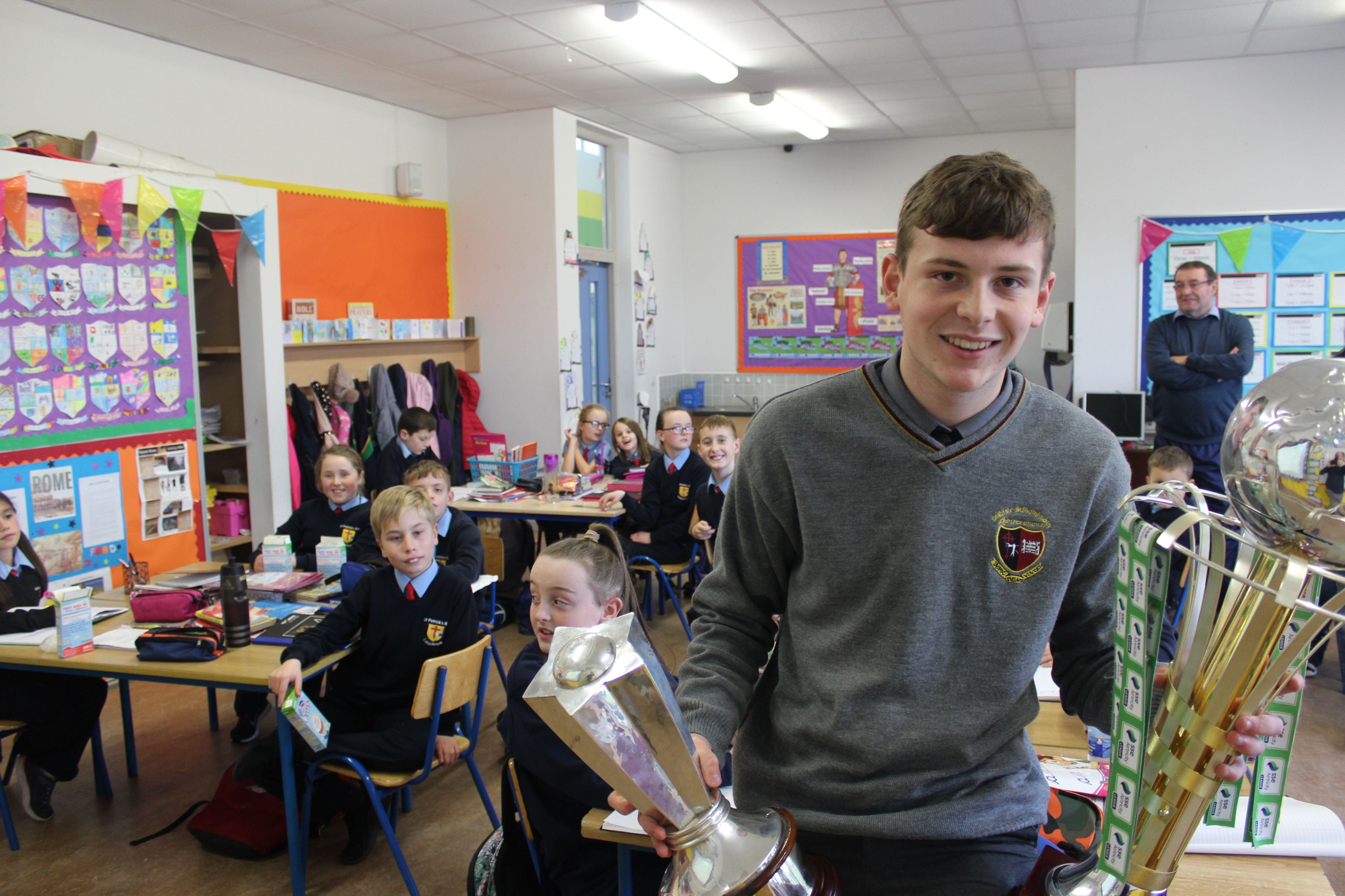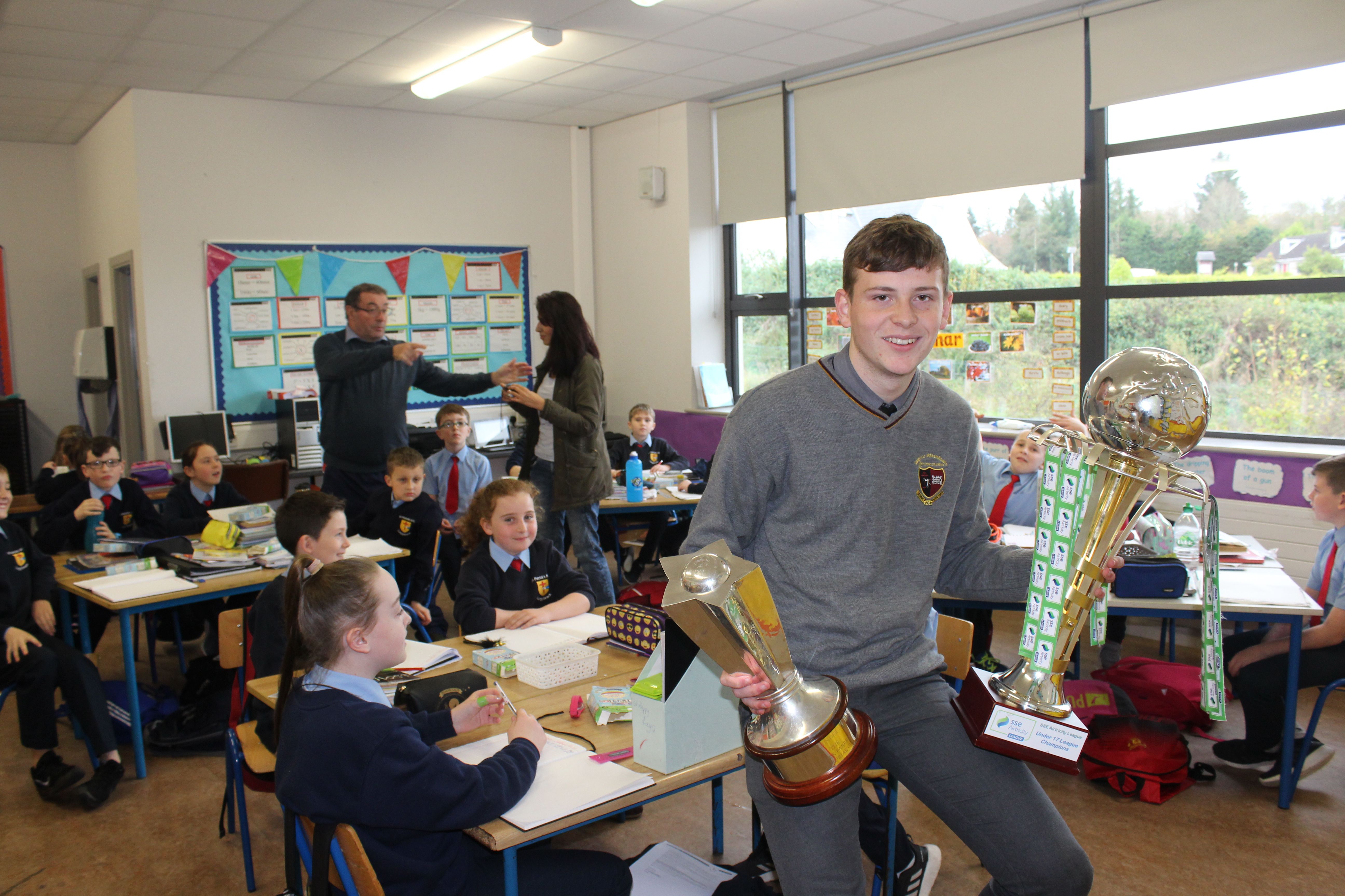 Past Pupil, Daragh Elison, brought the U17 League and Cup trophys to visit Lurgybrack NS. Daragh was captain of the successful U17 Finn Harps team.