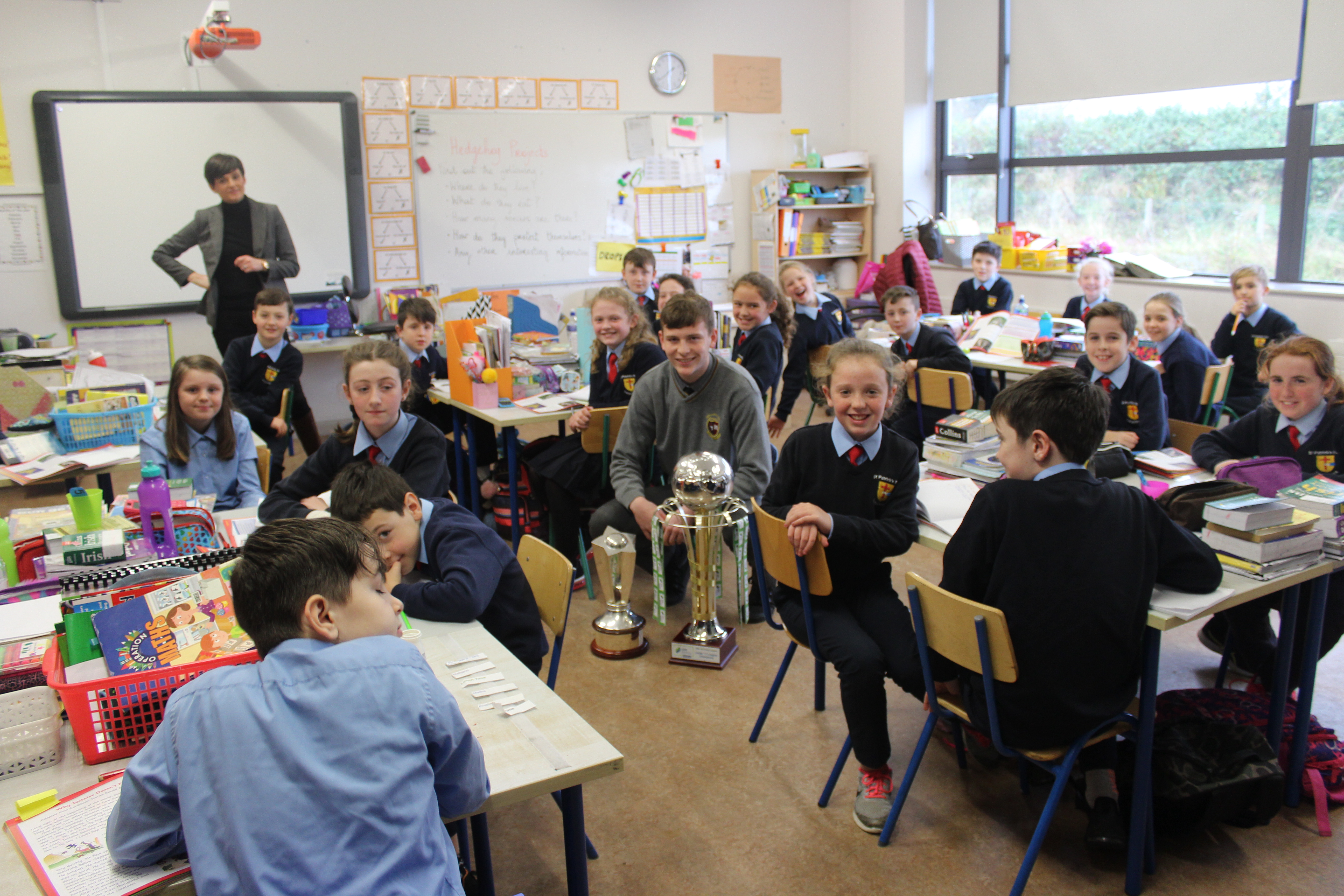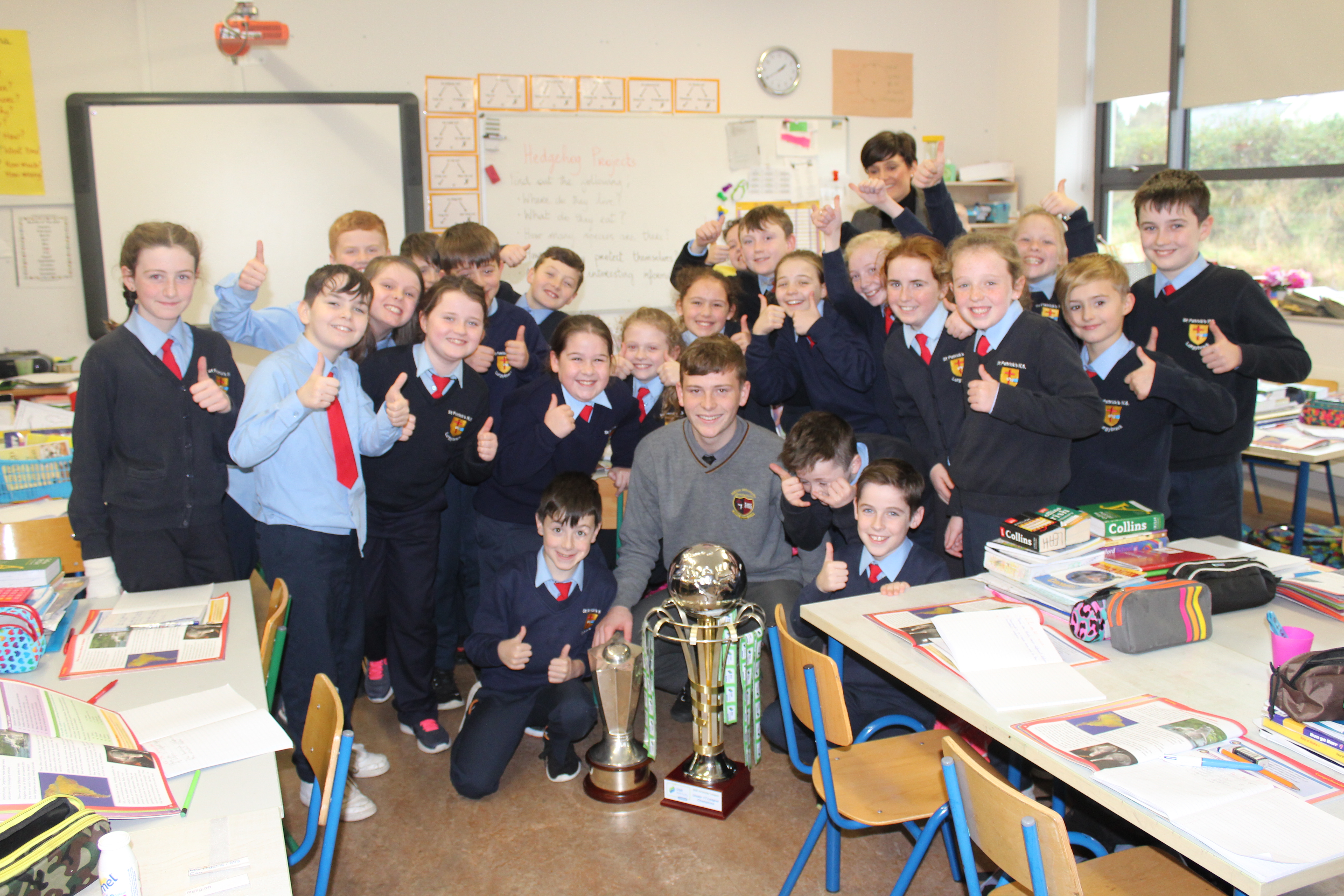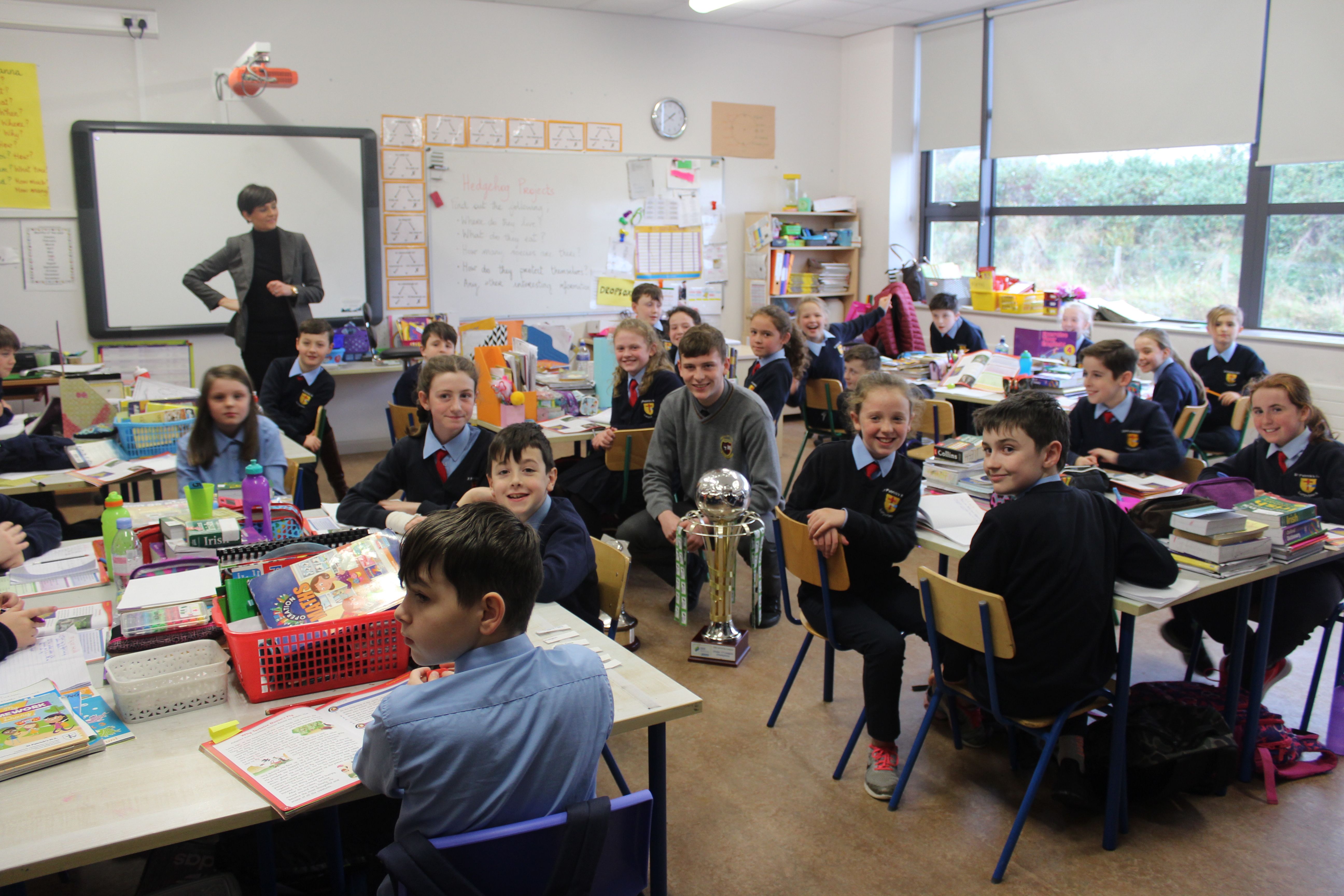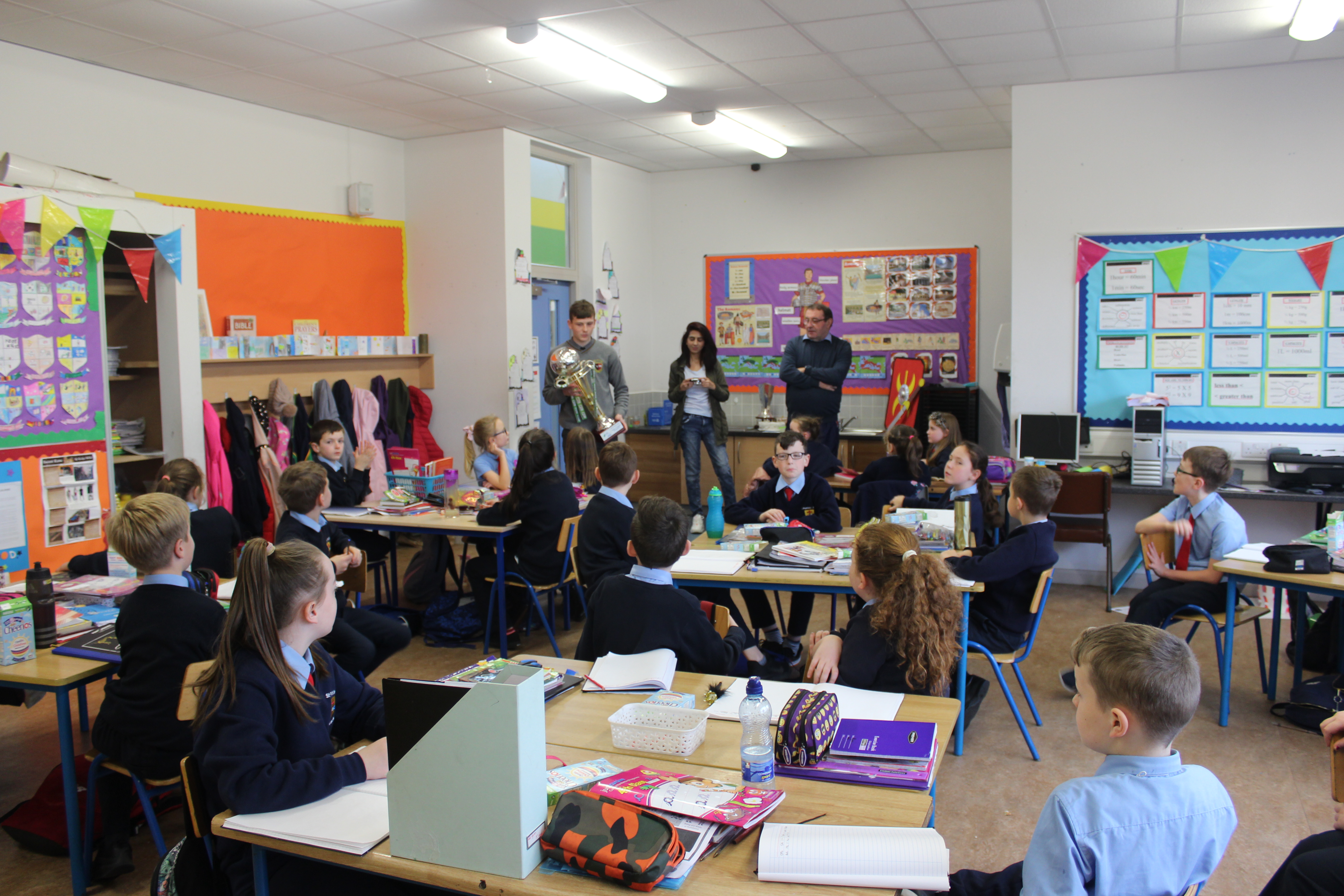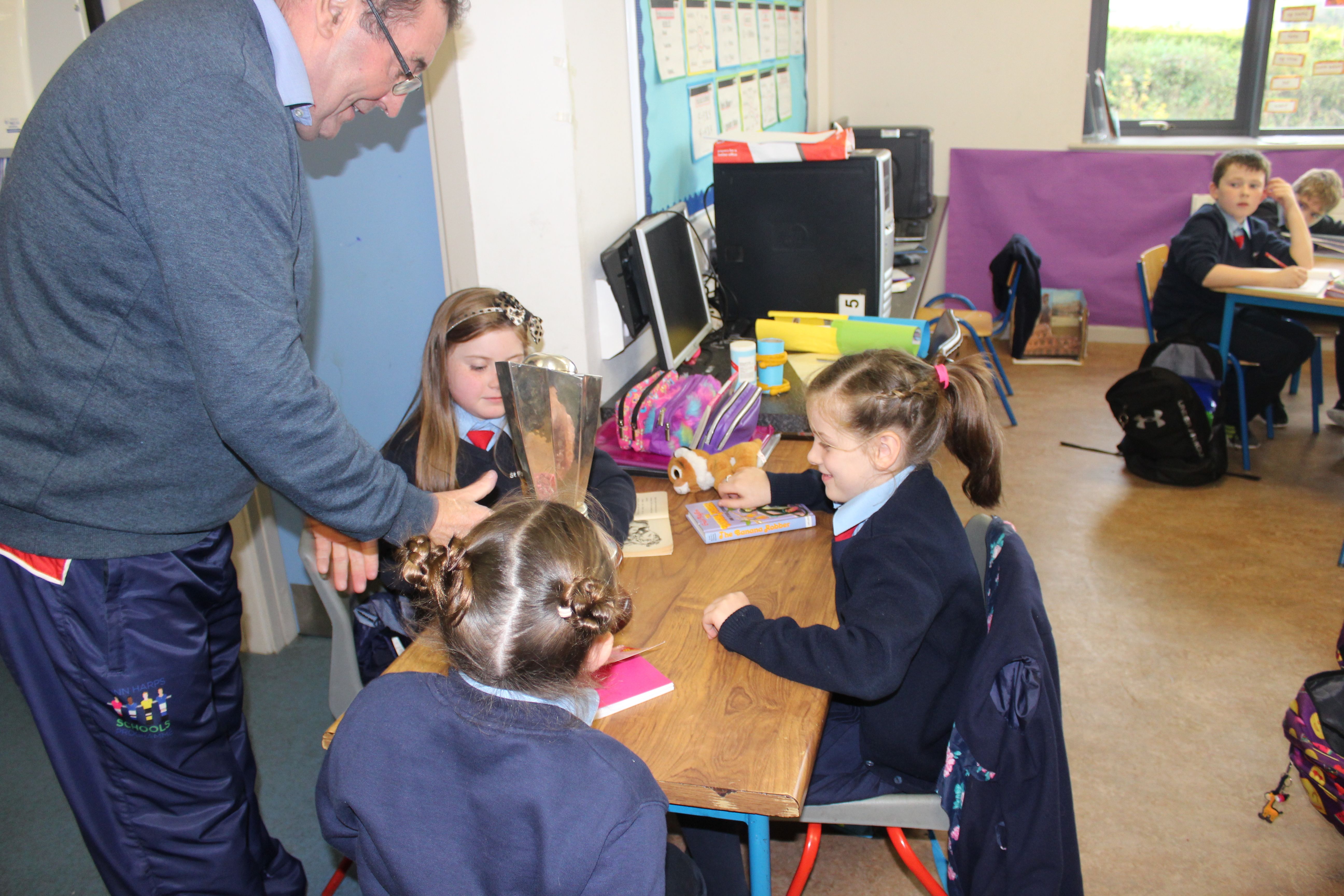 Past Pupil, Daragh Elison, brought the U17 League and Cup trophys to visit Lurgybrack NS. Daragh was captain of the successful U17 Finn Harps team.