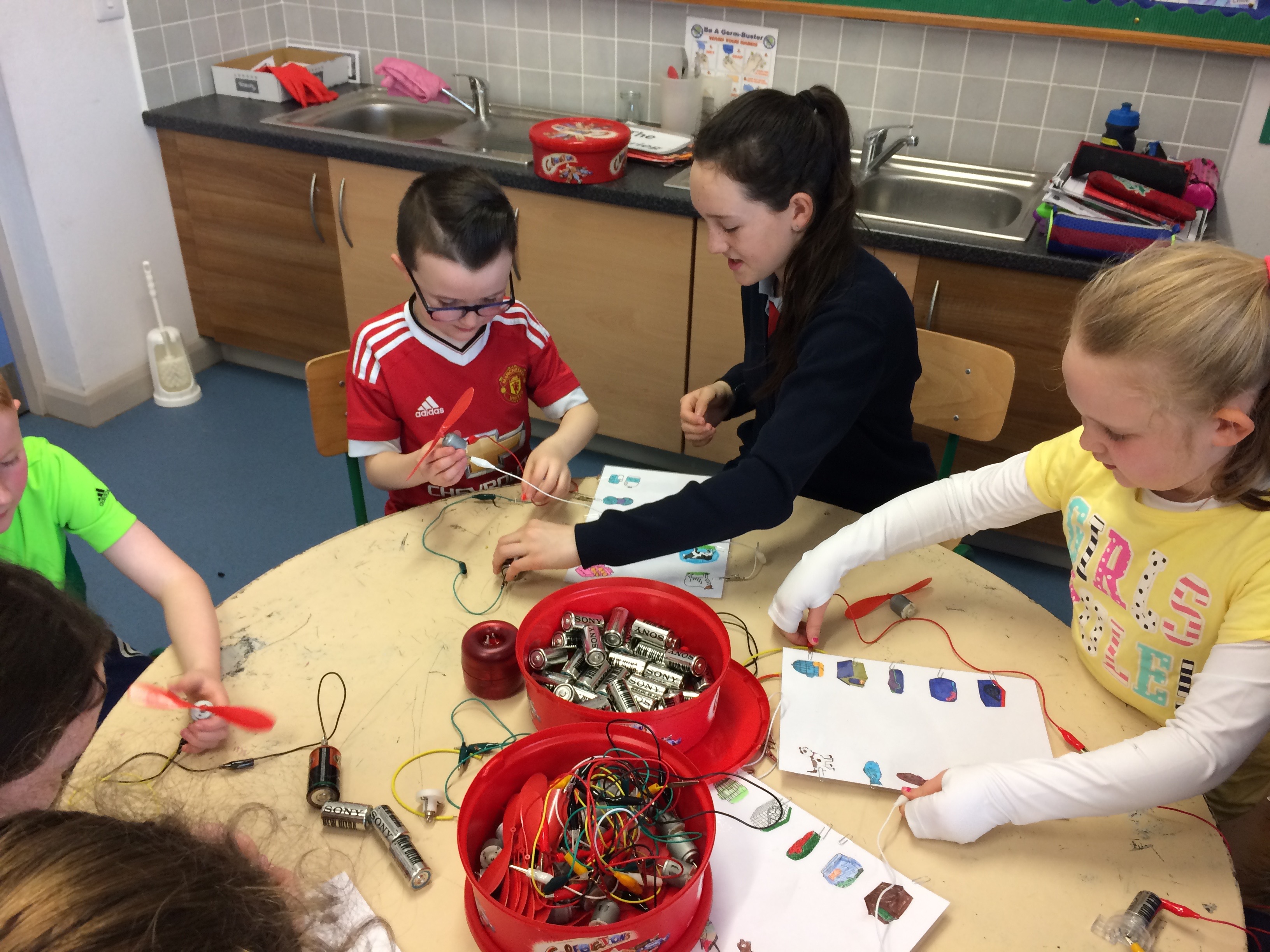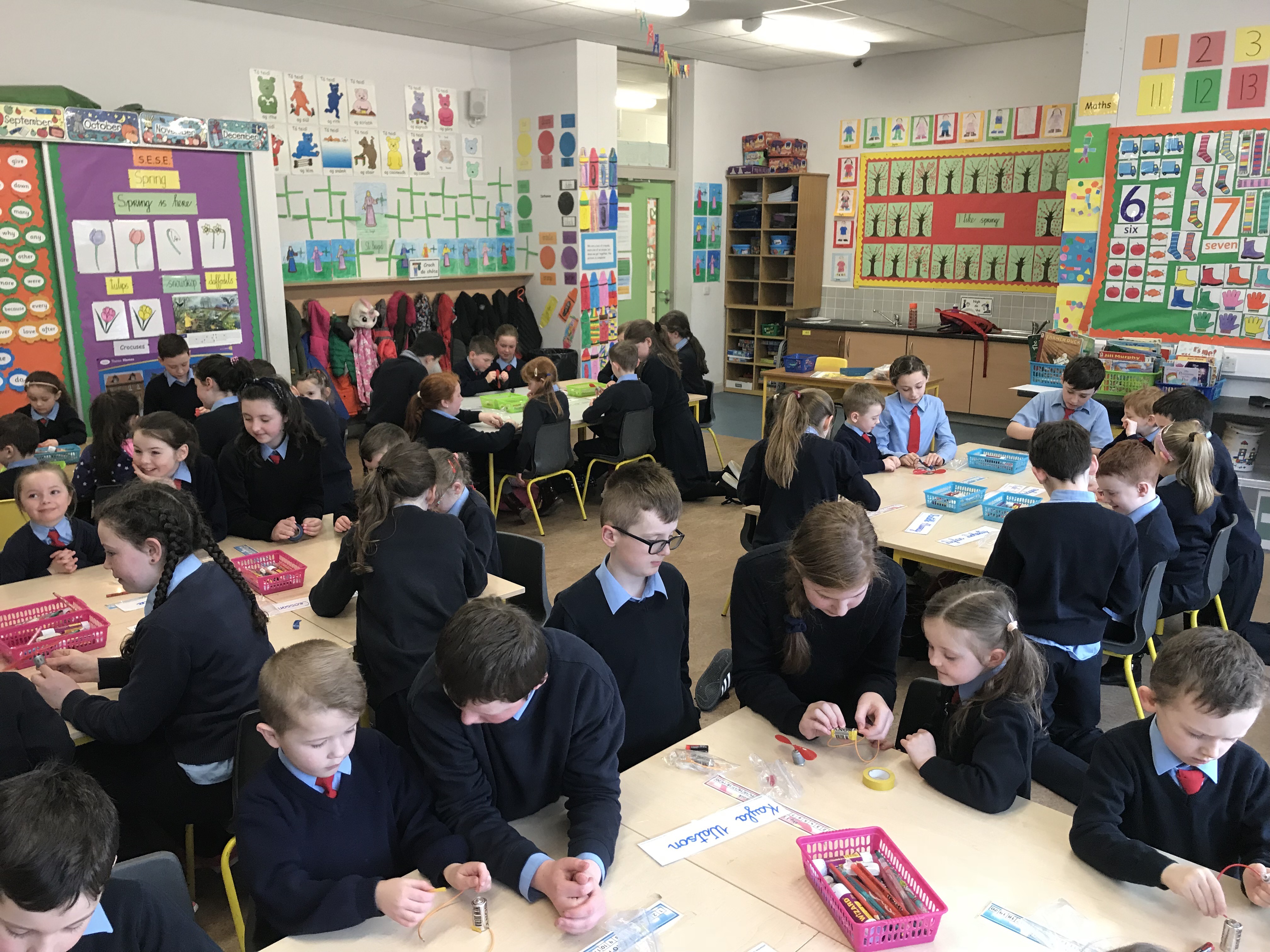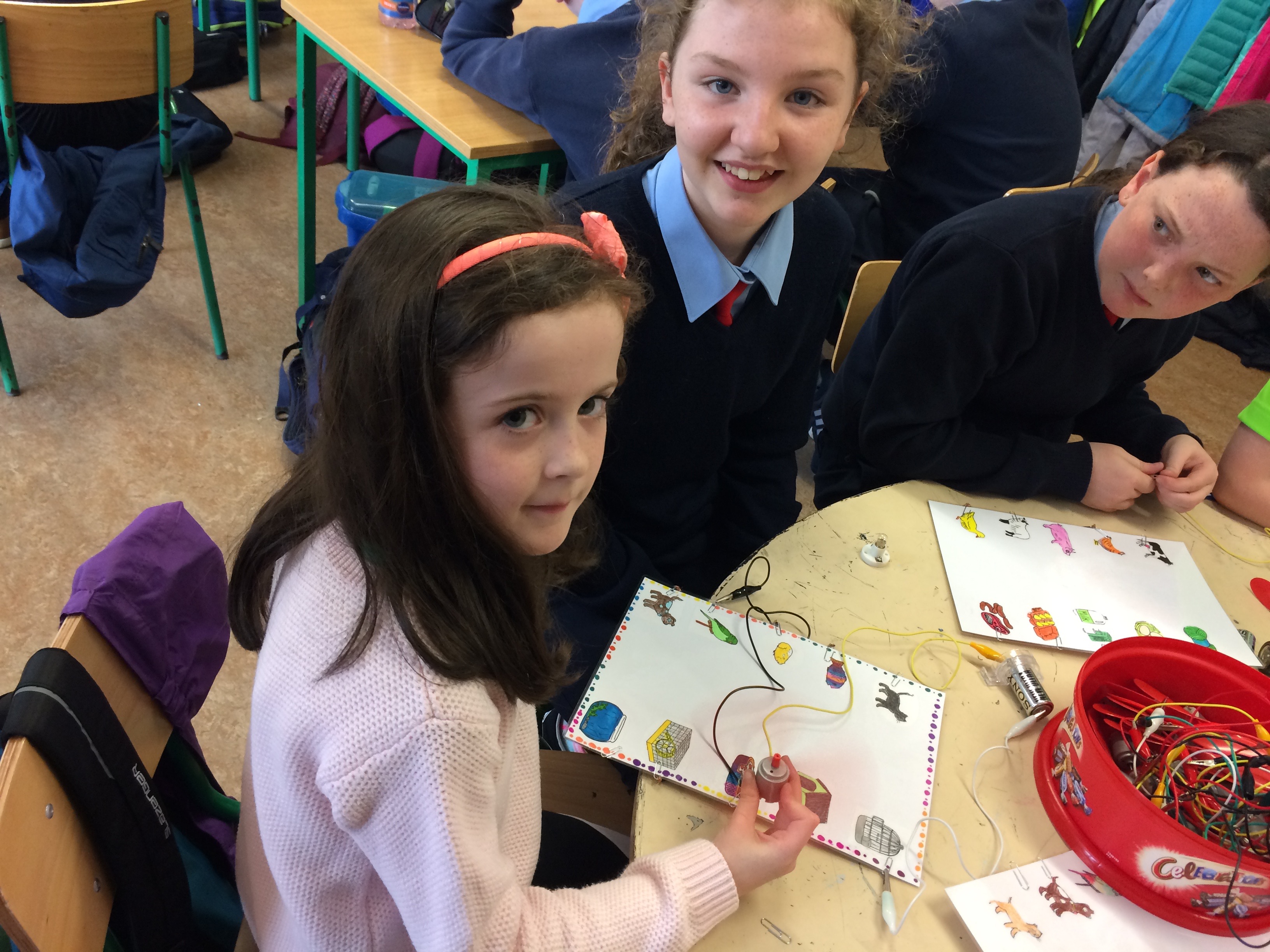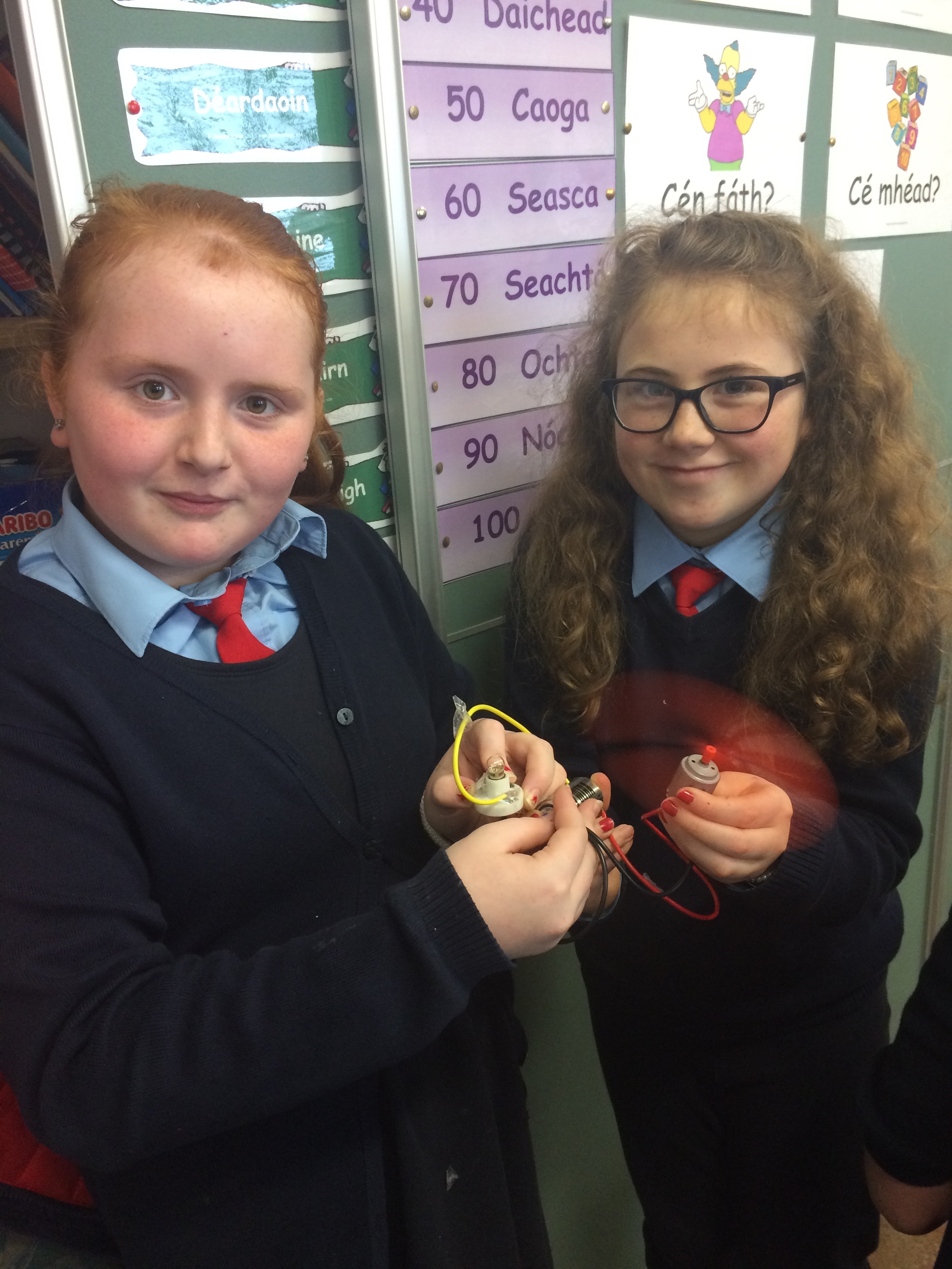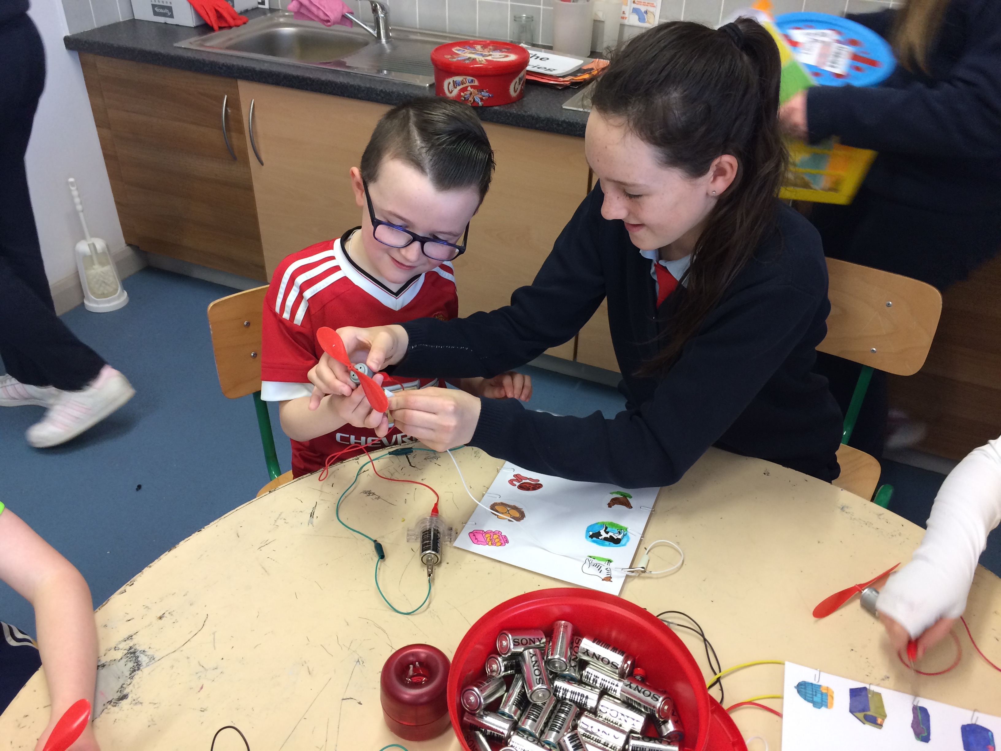 Senior classes made electric quizzes for 1st class. If they got the answer right, the fan rotated!