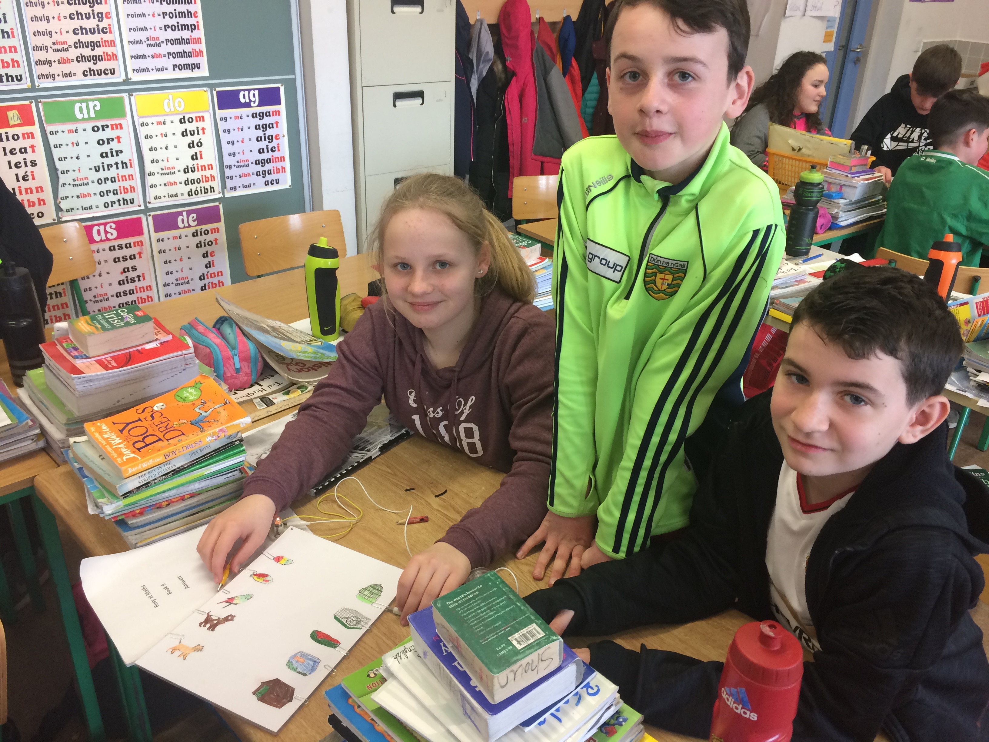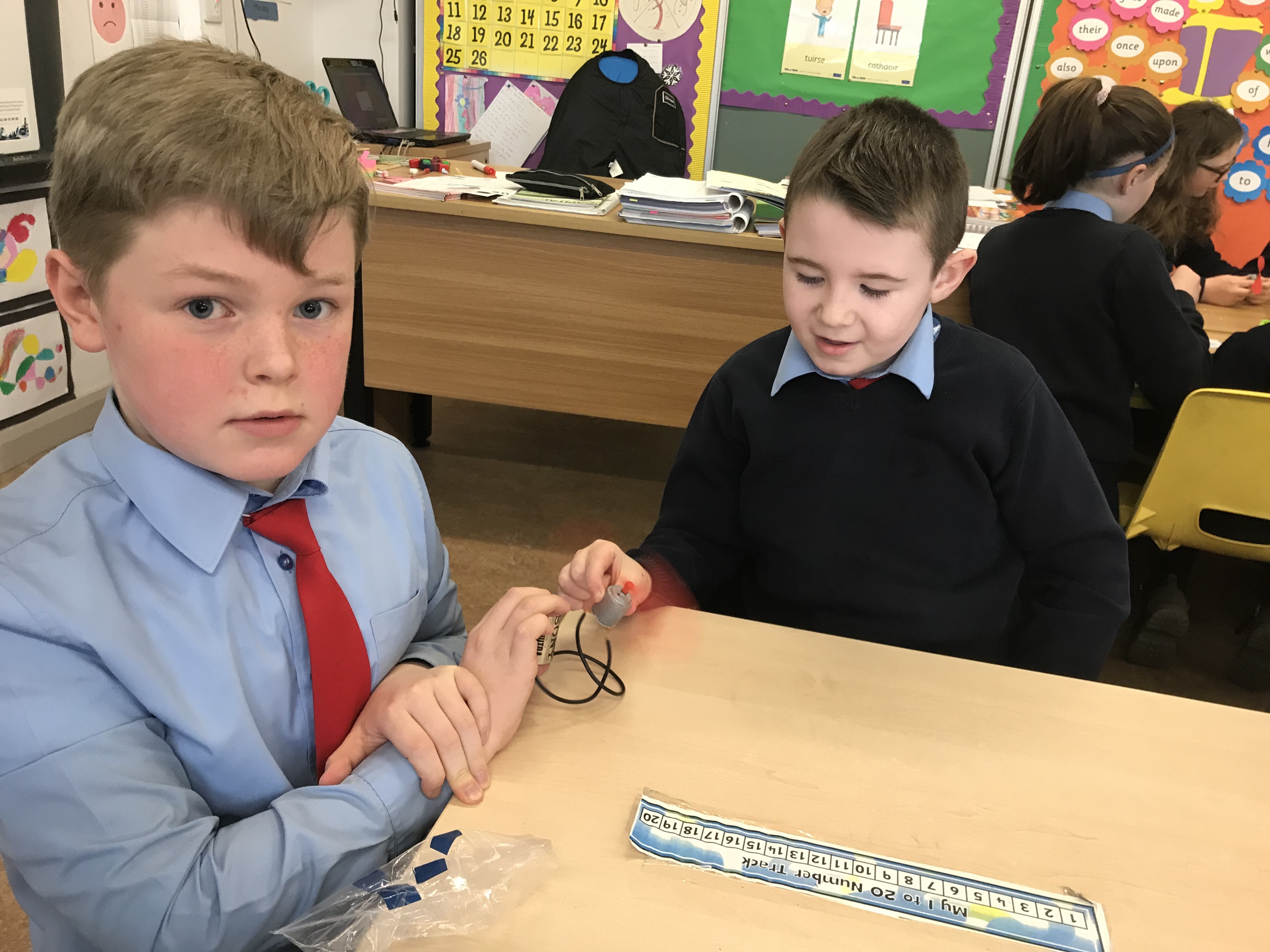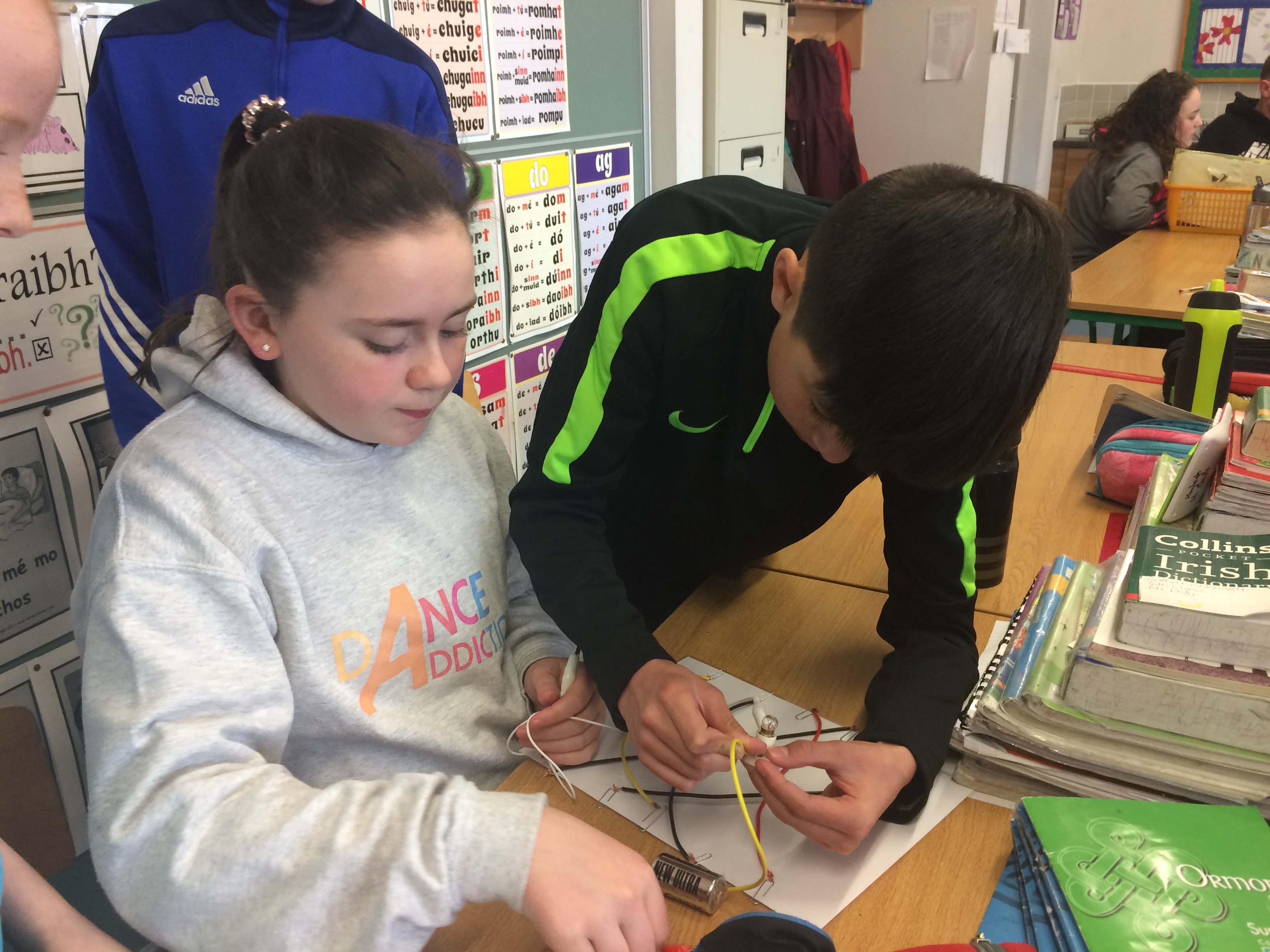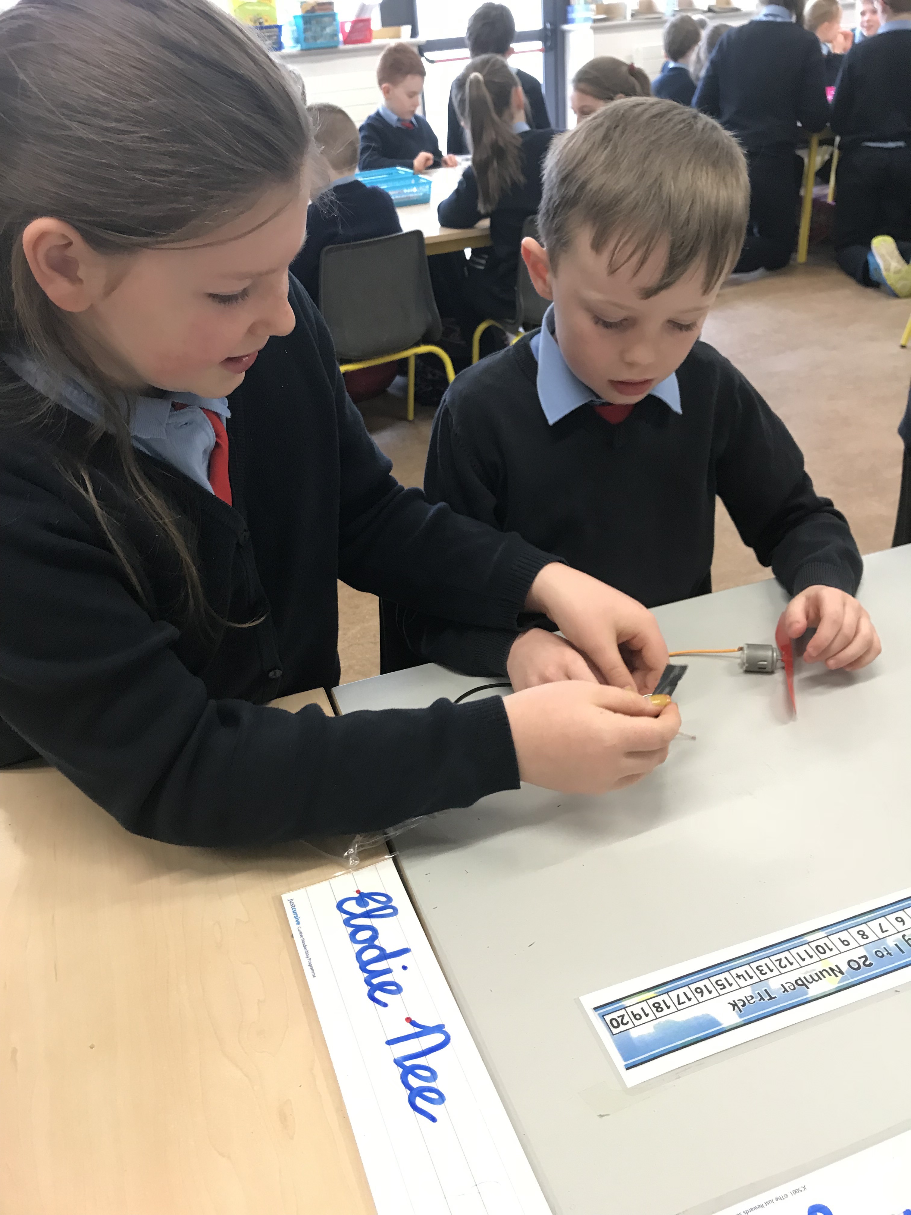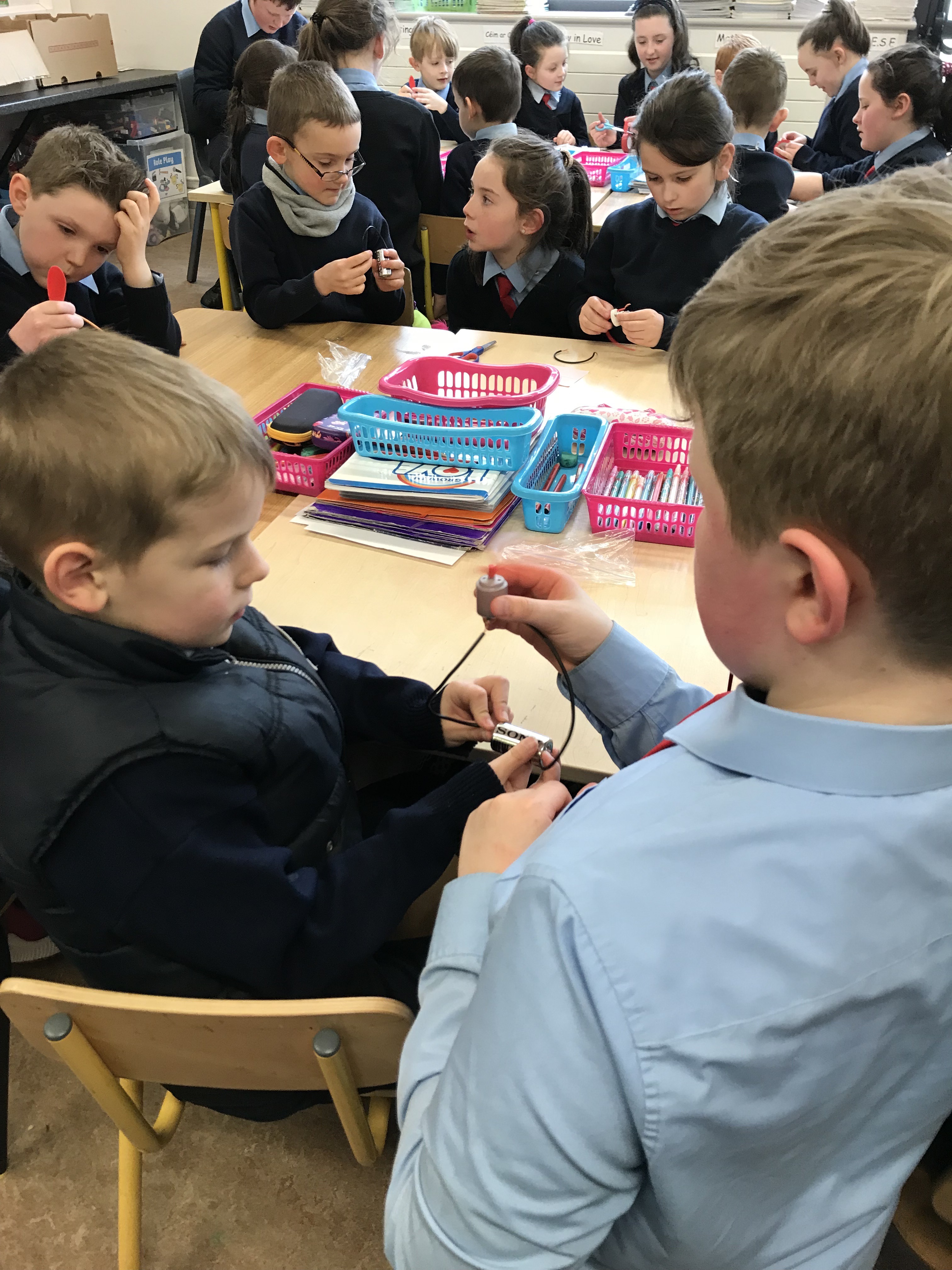 Senior classes made electric quizzes for 1st class. If they got the answer right, the fan rotated!