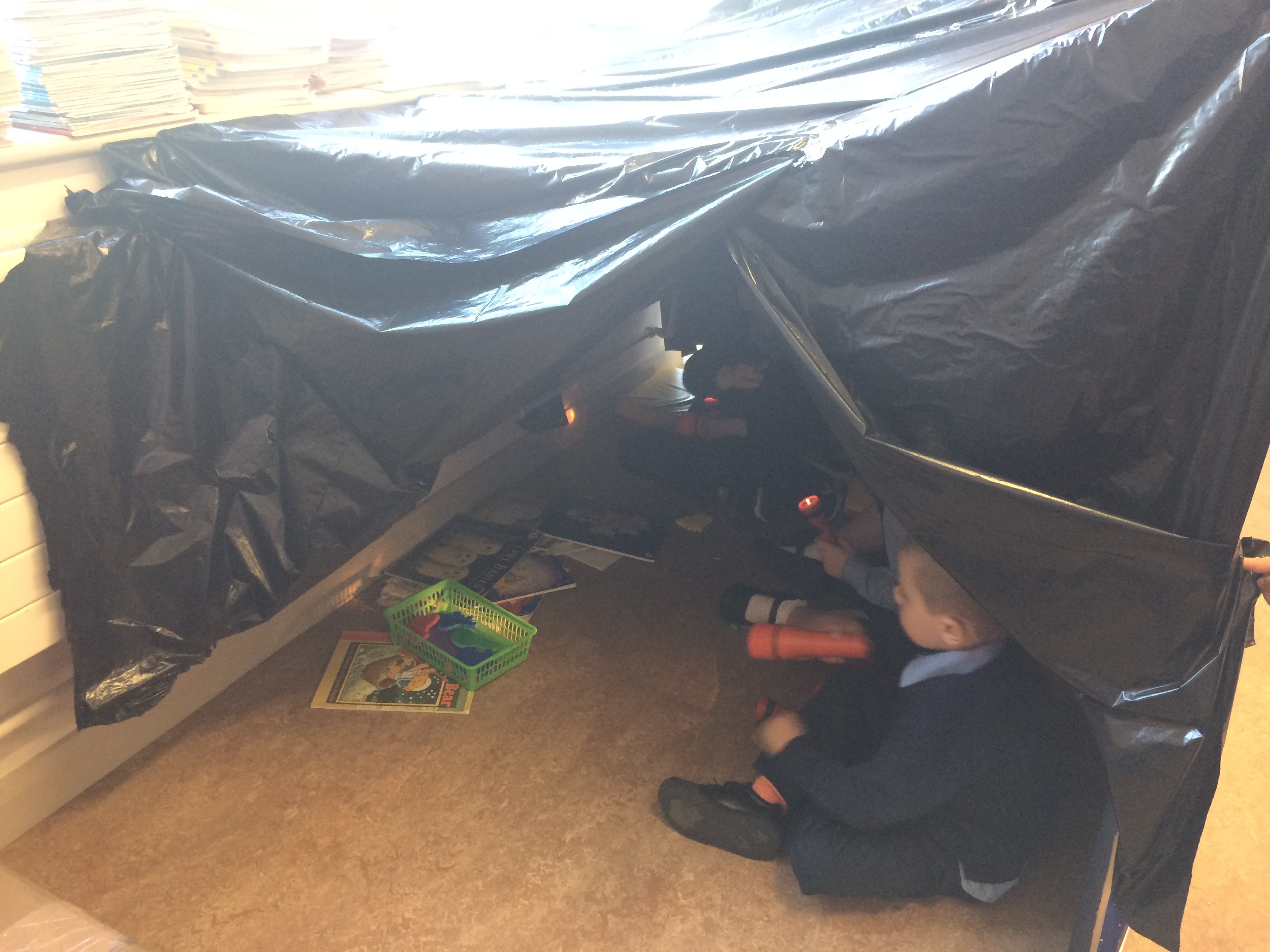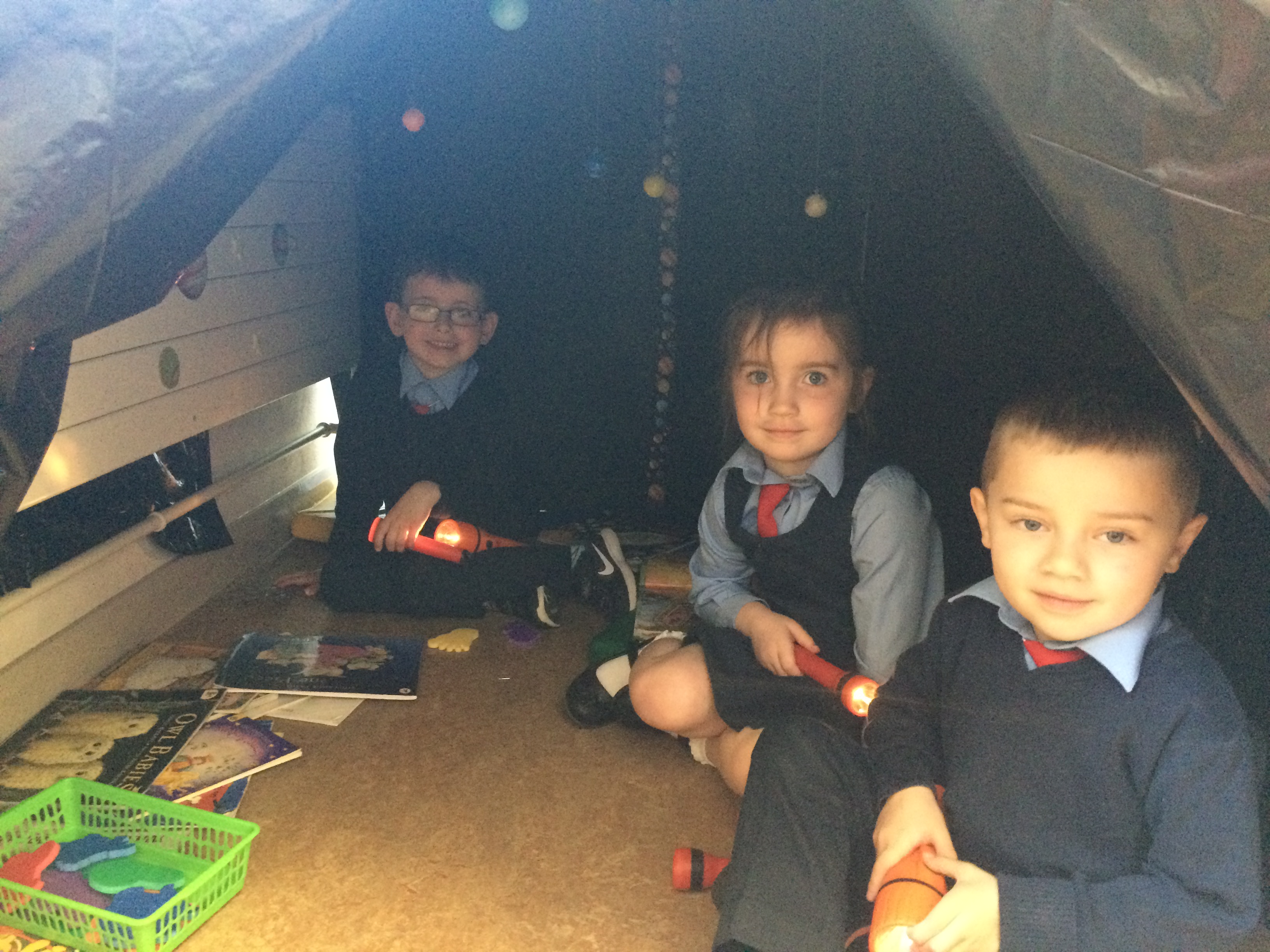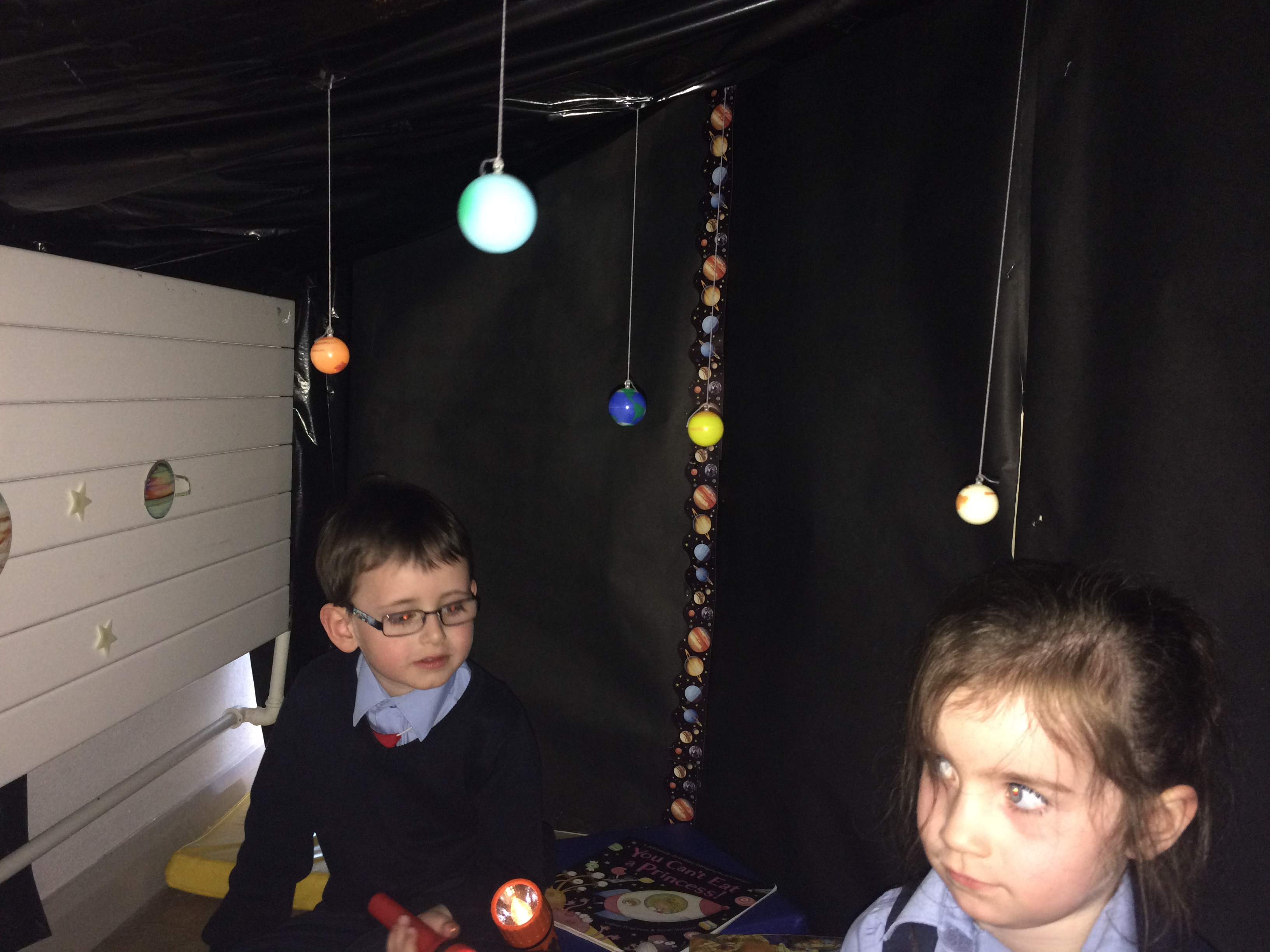 Junior Infants experimented with torches, learning about night and day, light and shadows and the solar system inside the brilliant cave in their classroom.