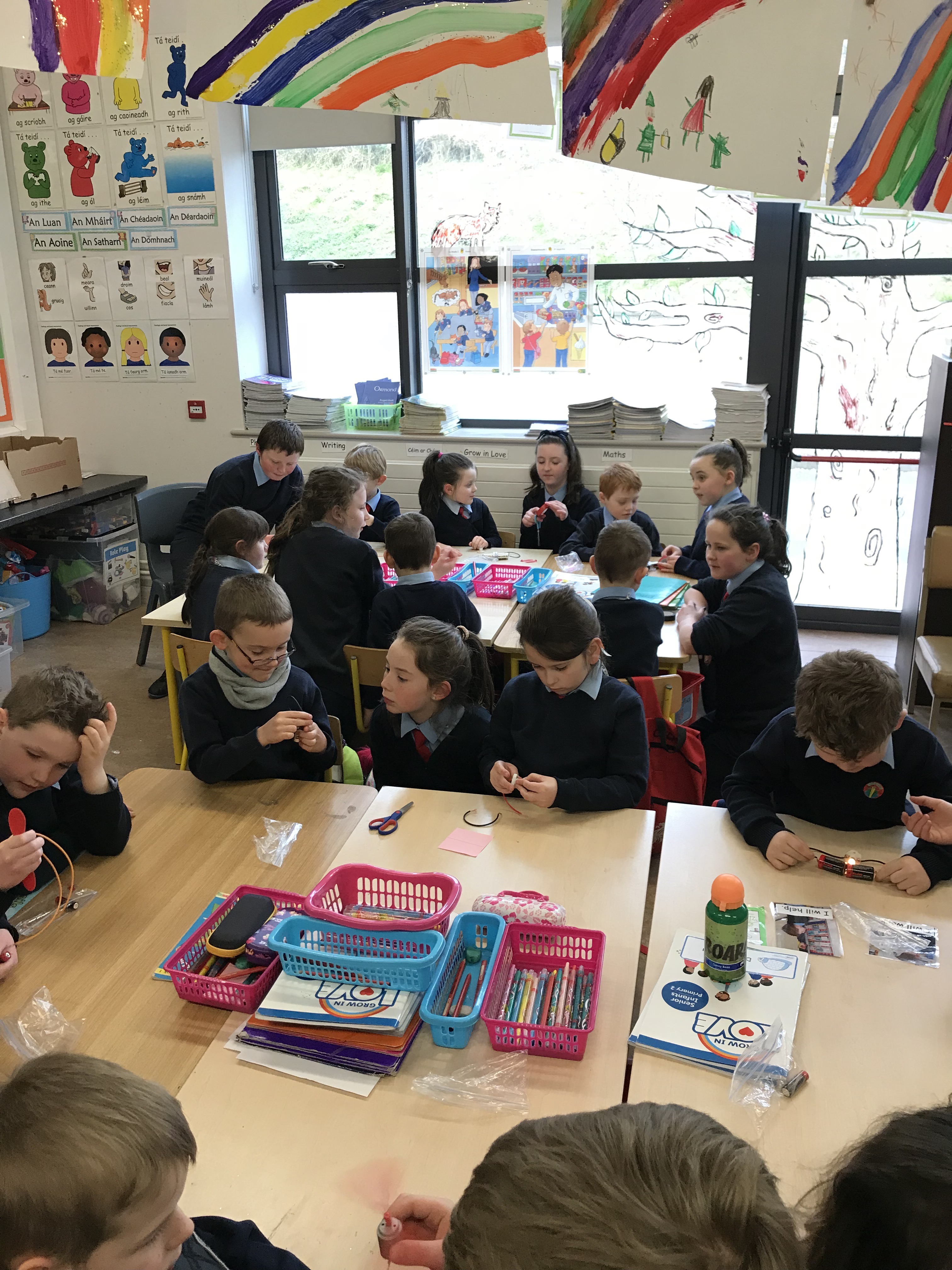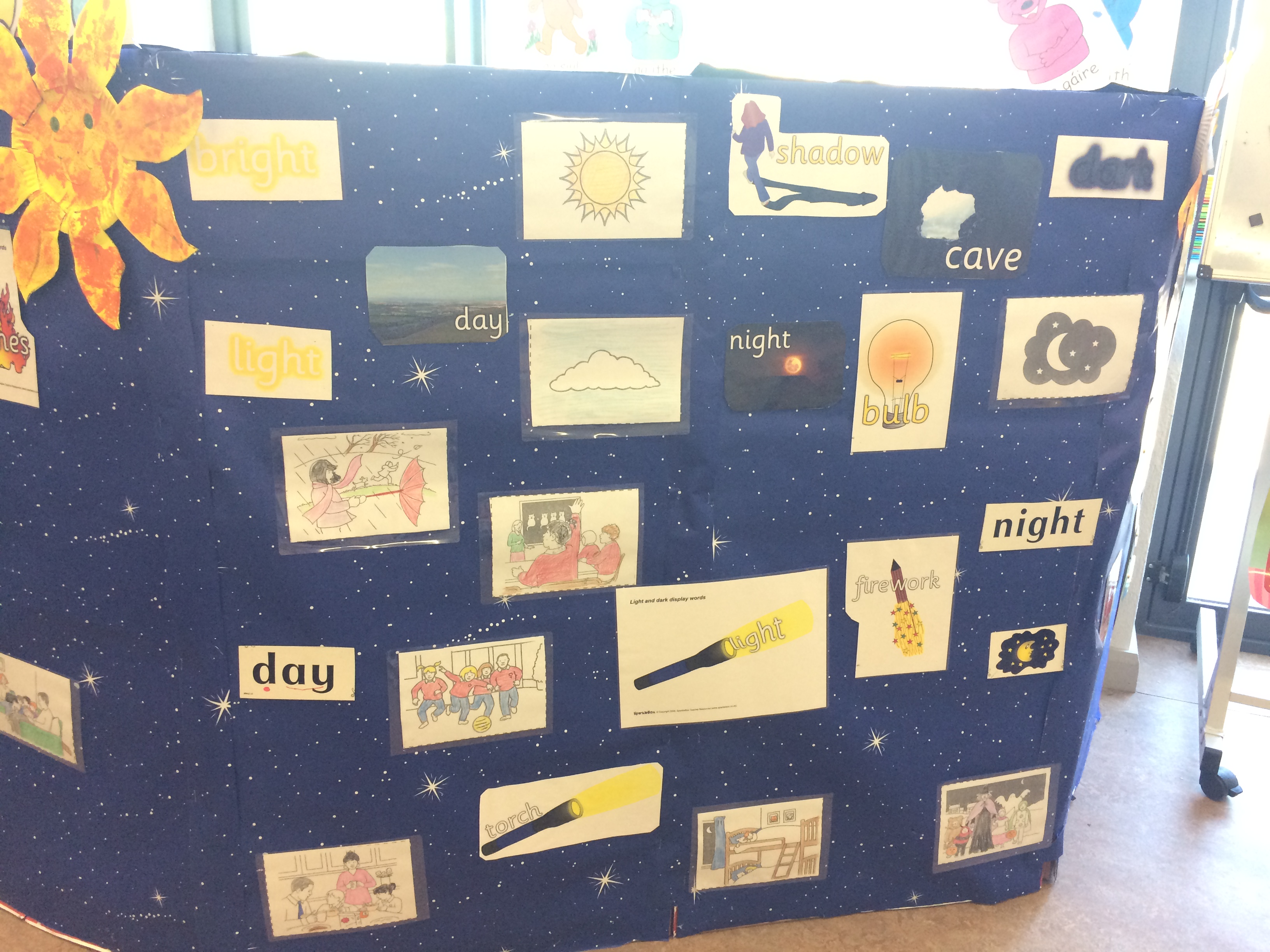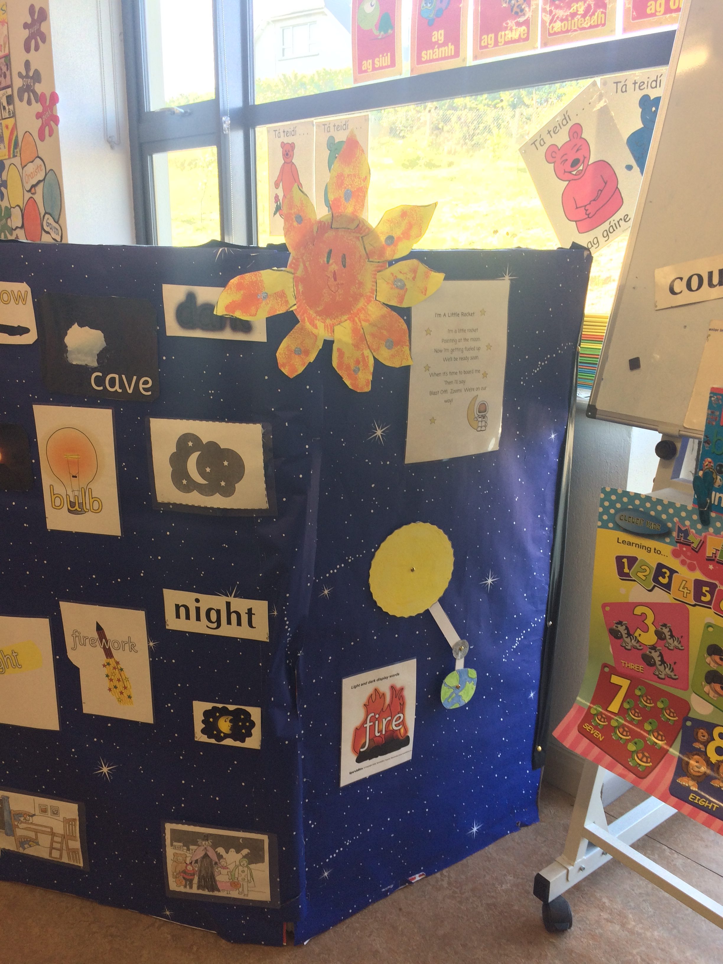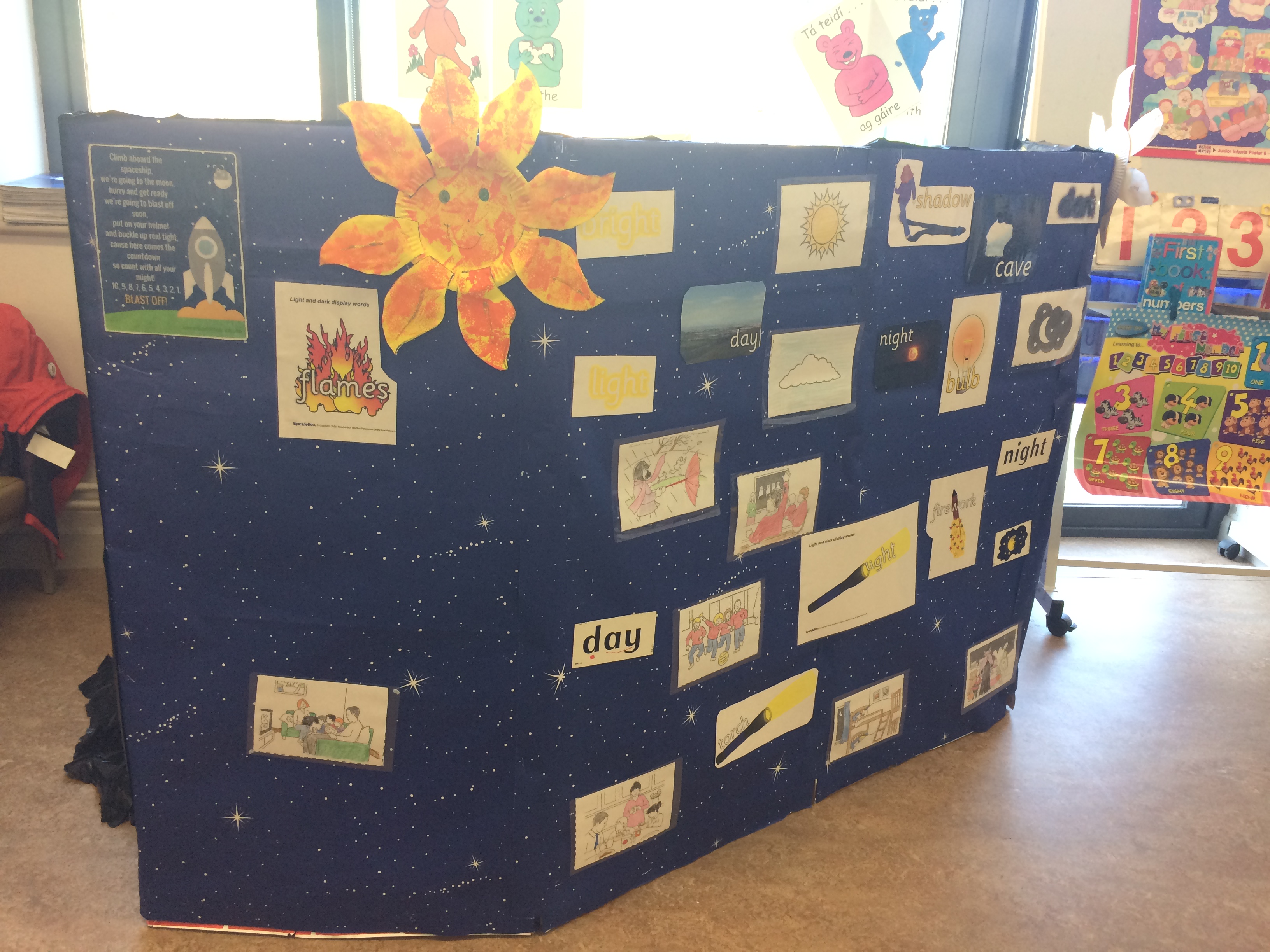 Junior Infants experimented with torches, learning about night and day, light and shadows and the solar system inside the brilliant cave in their classroom.
