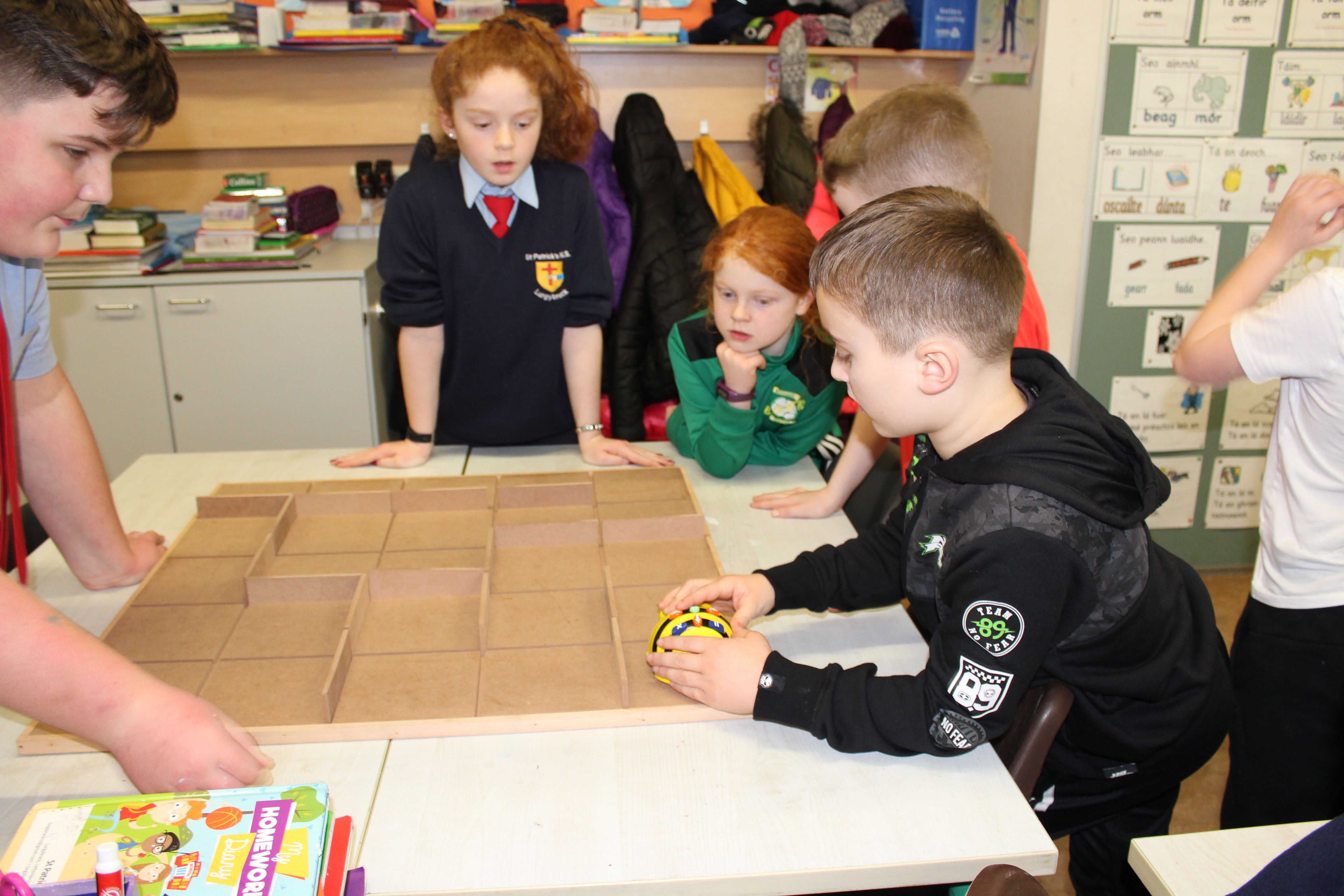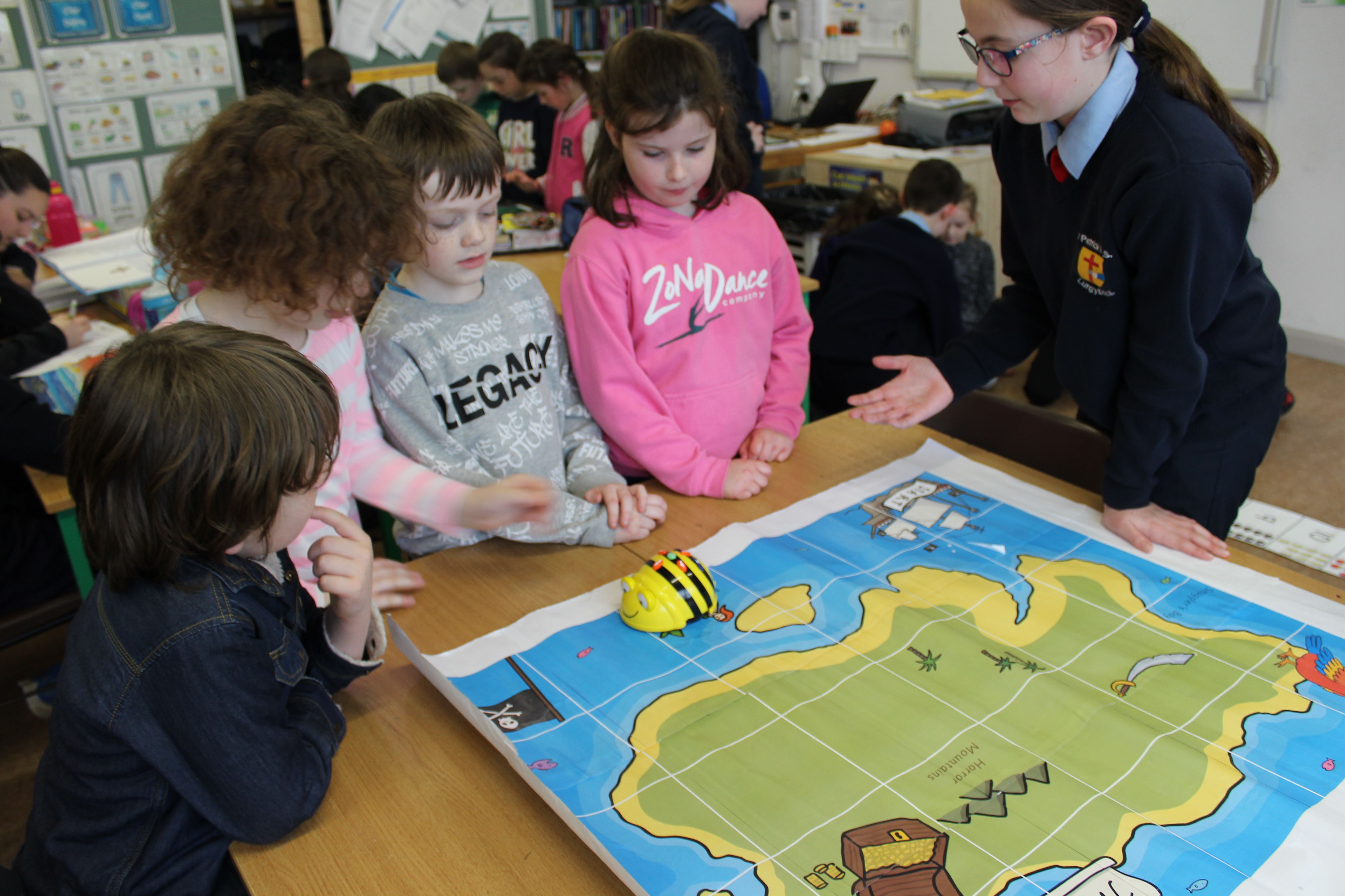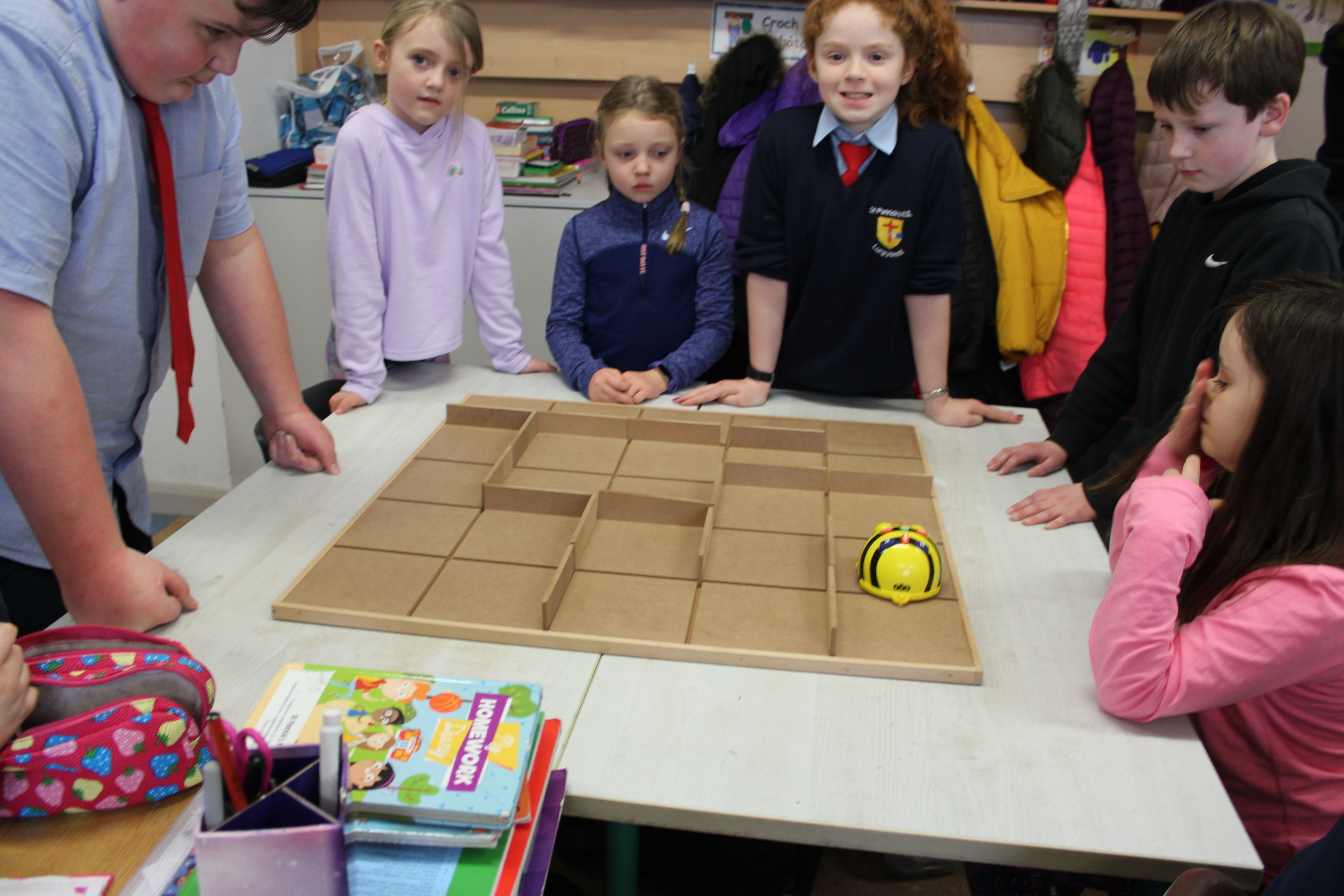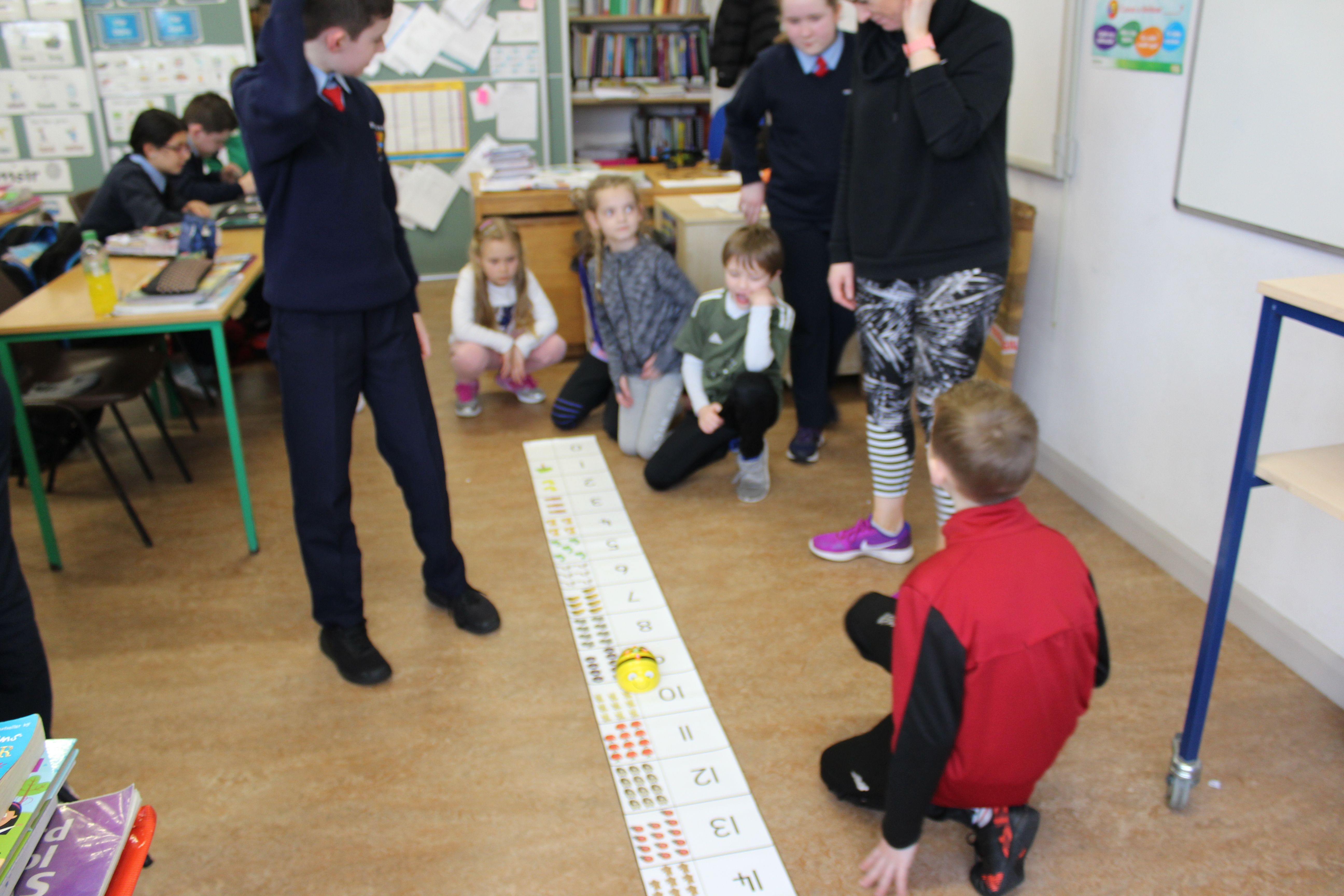 3rd class, with help from 6th, were developing problem solving skills through concepts of computational thinking and coding using Bee Bots. Bee Bots are exciting programmable robots designed for use by children. They are a great resource to introduce simple programming and coding to children. These easy to operate and friendly robots are a perfect tool for teaching directionality, sequencing, estimation and problem-solving. The children had to use specific vocabulary associated with coding and understand that they can control the device by creating simple algorithms.