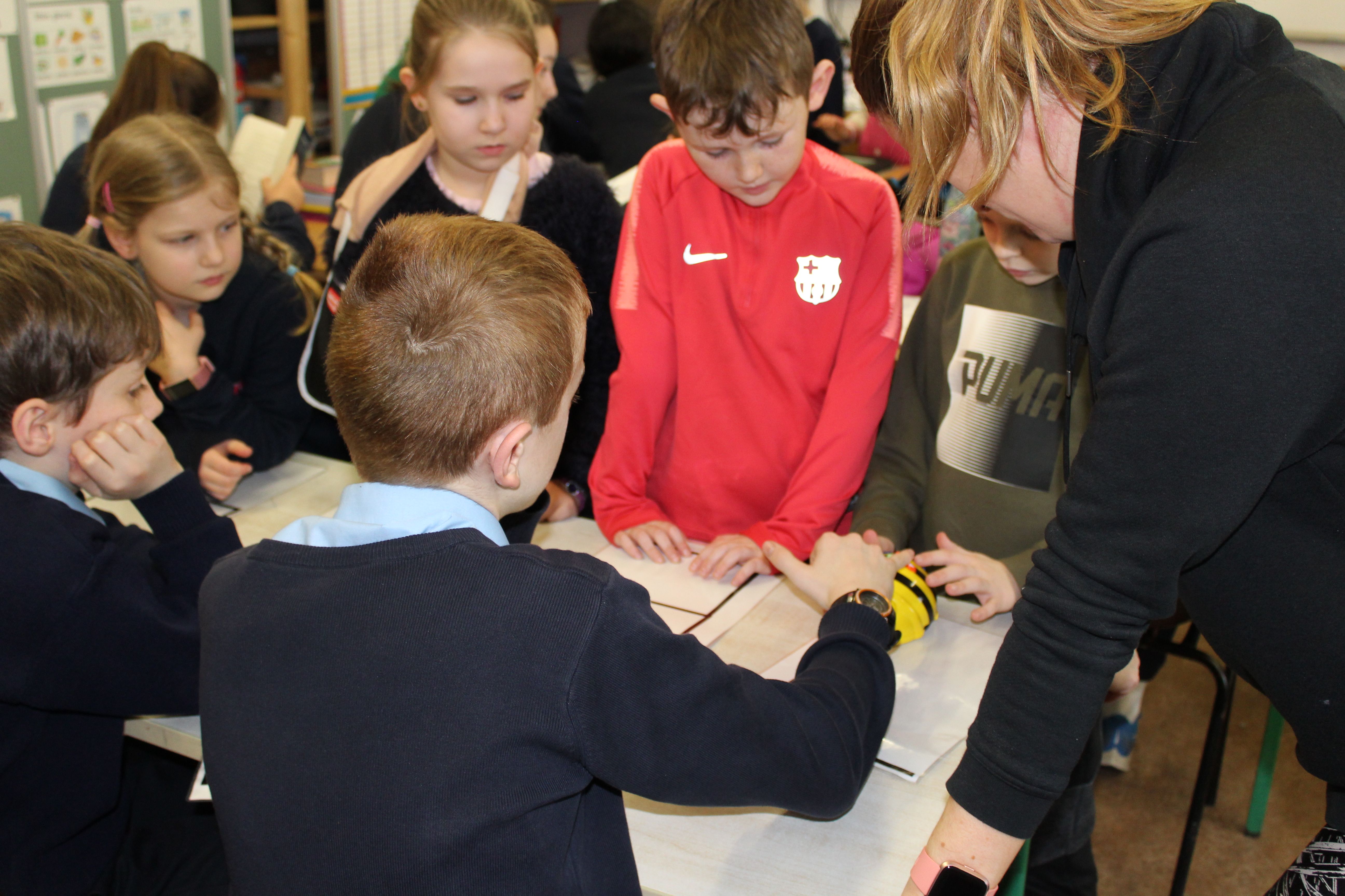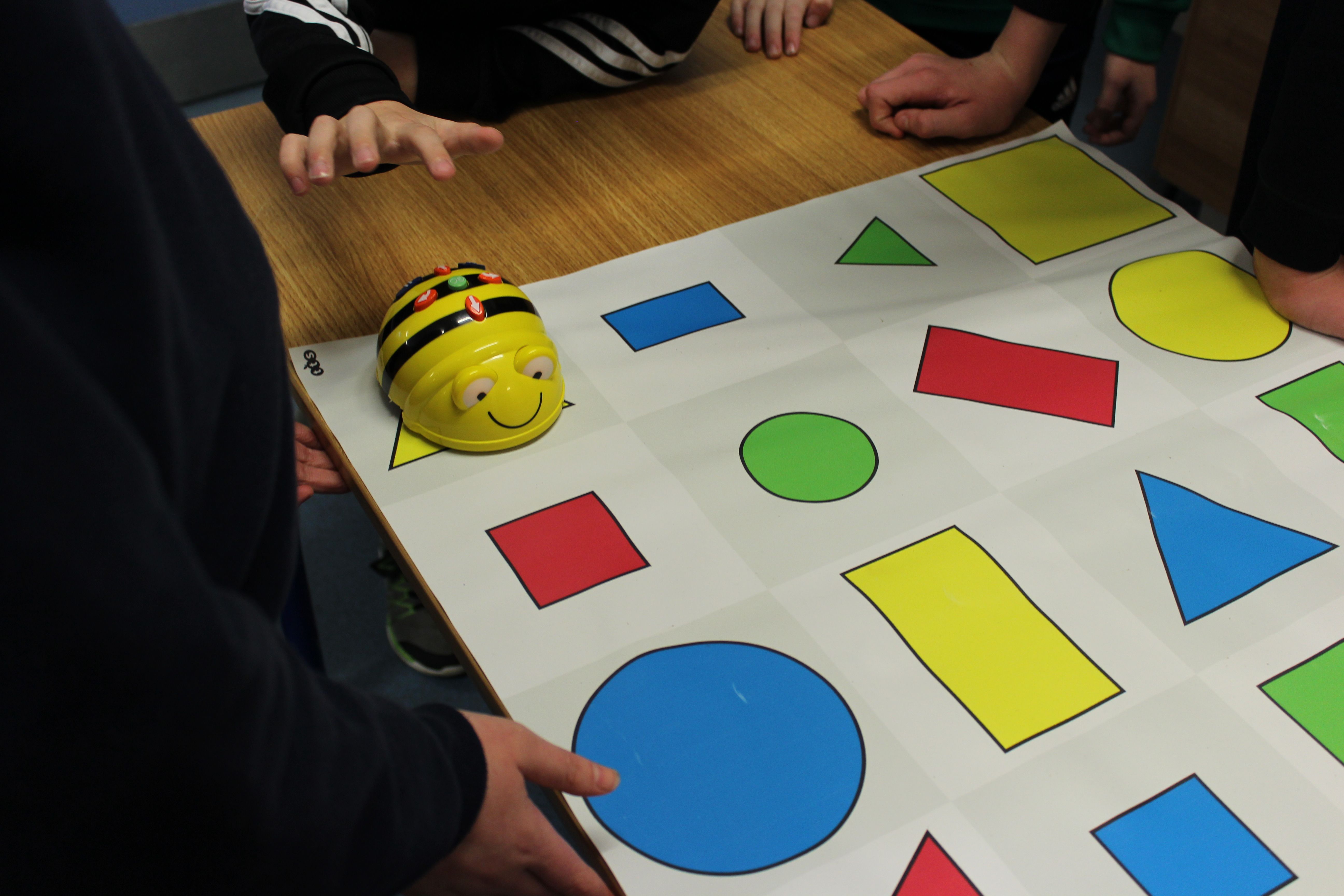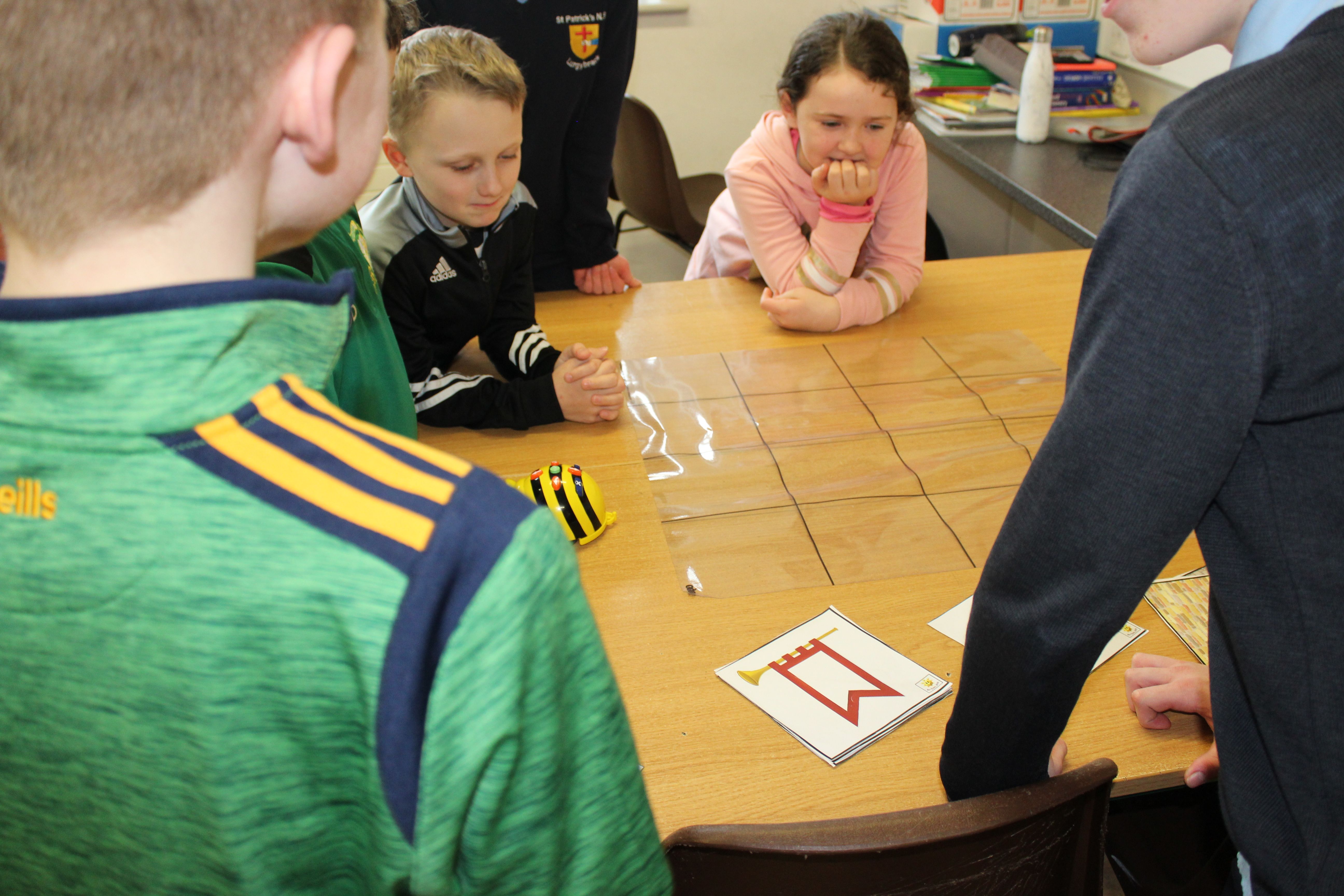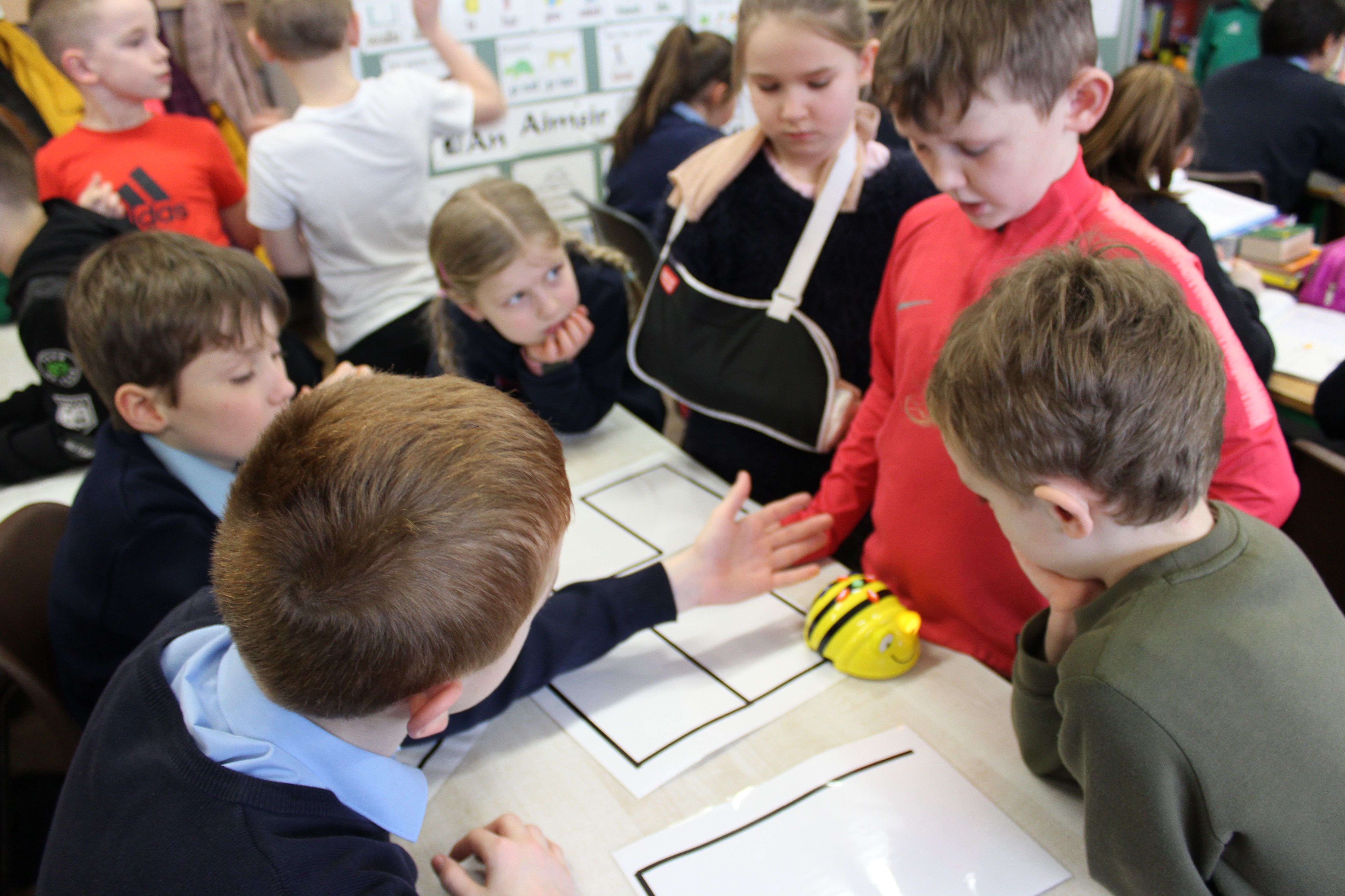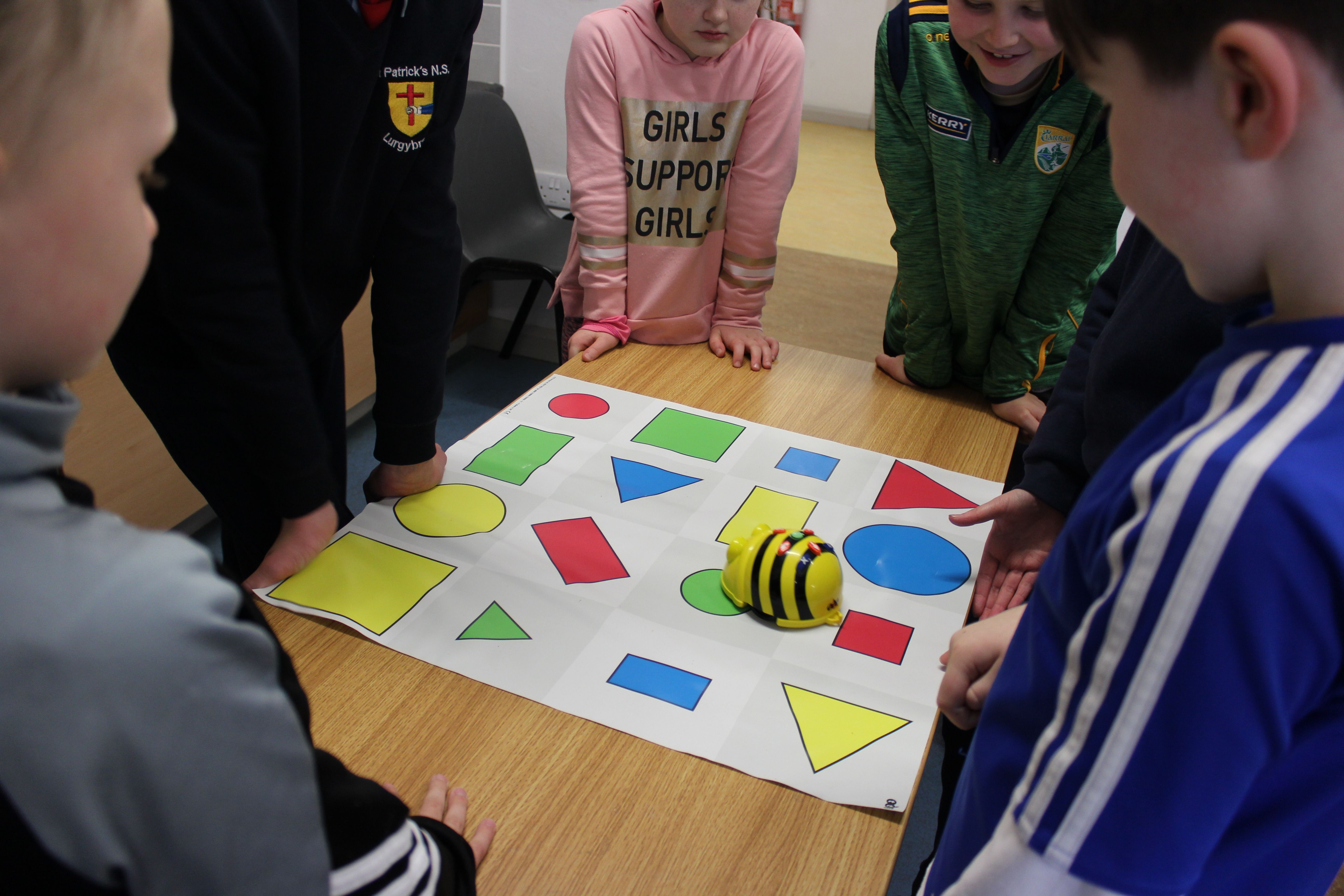 3rd class, with help from 6th, were developing problem solving skills through concepts of computational thinking and coding using Bee Bots. Bee Bots are exciting programmable robots designed for use by children. They are a great resource to introduce simple programming and coding to children. These easy to operate and friendly robots are a perfect tool for teaching directionality, sequencing, estimation and problem-solving. The children had to use specific vocabulary associated with coding and understand that they can control the device by creating simple algorithms.