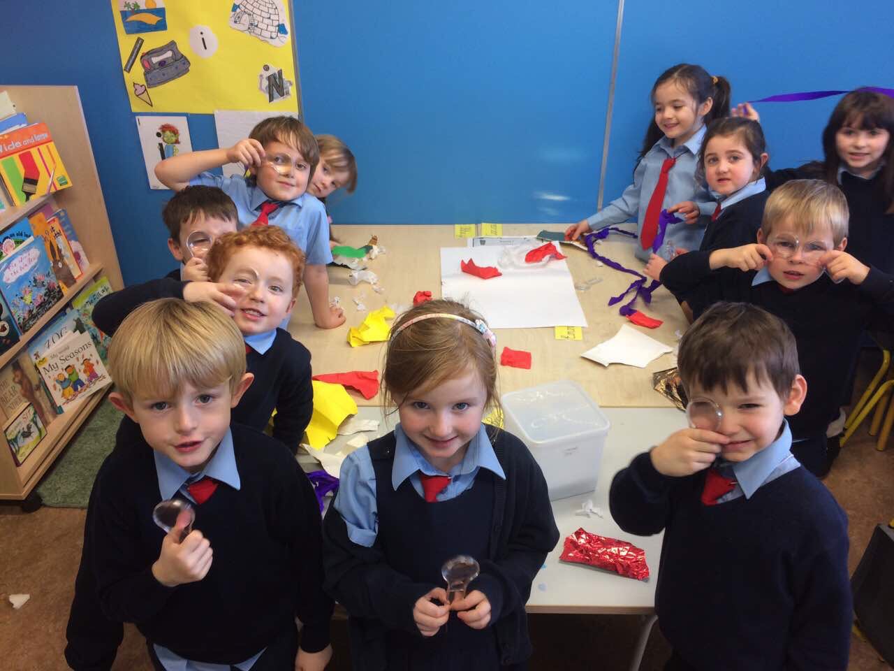 Materials– Junior Infants investigated the different properties of paper. They used magnifying glasses to look at its composition. They used weights to test for strength, and used water to test for absorbency. Well done Junior Infants!